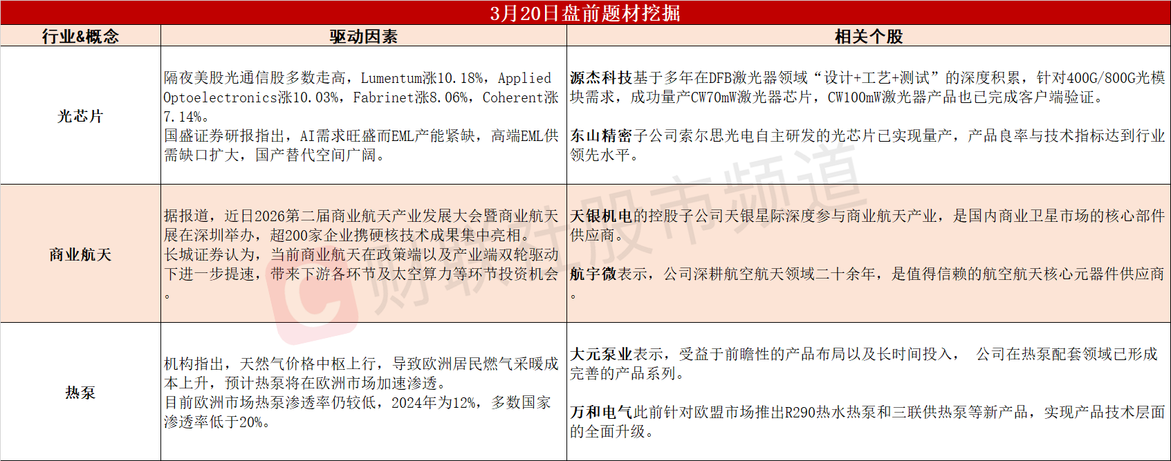 ①产能紧缺!行业龙头连日逆势大涨,光芯片有望迎黄金机遇期。②商业航天进一步提速,火箭、卫星、运管等各环节投资机遇凸显。③天然气价格中枢上行,热泵有望在欧洲市场加速渗透。