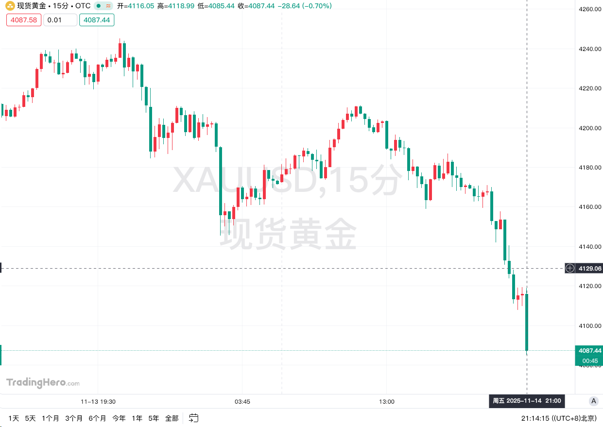 财联社11月14日电,现货黄金跌2.02%,报4087.08美元/盎司。现货白银跌1.84%,报51.31美元/盎司。