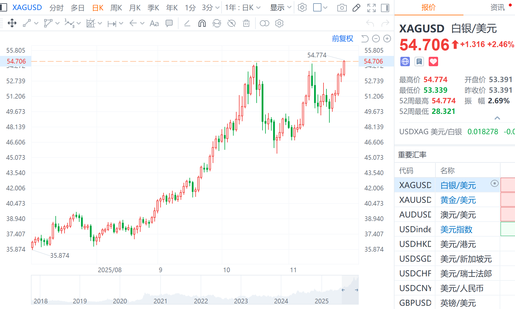 财联社11月28日电,现货白银日内涨幅扩大至2%,报54.43美元/盎司,创历史新高。