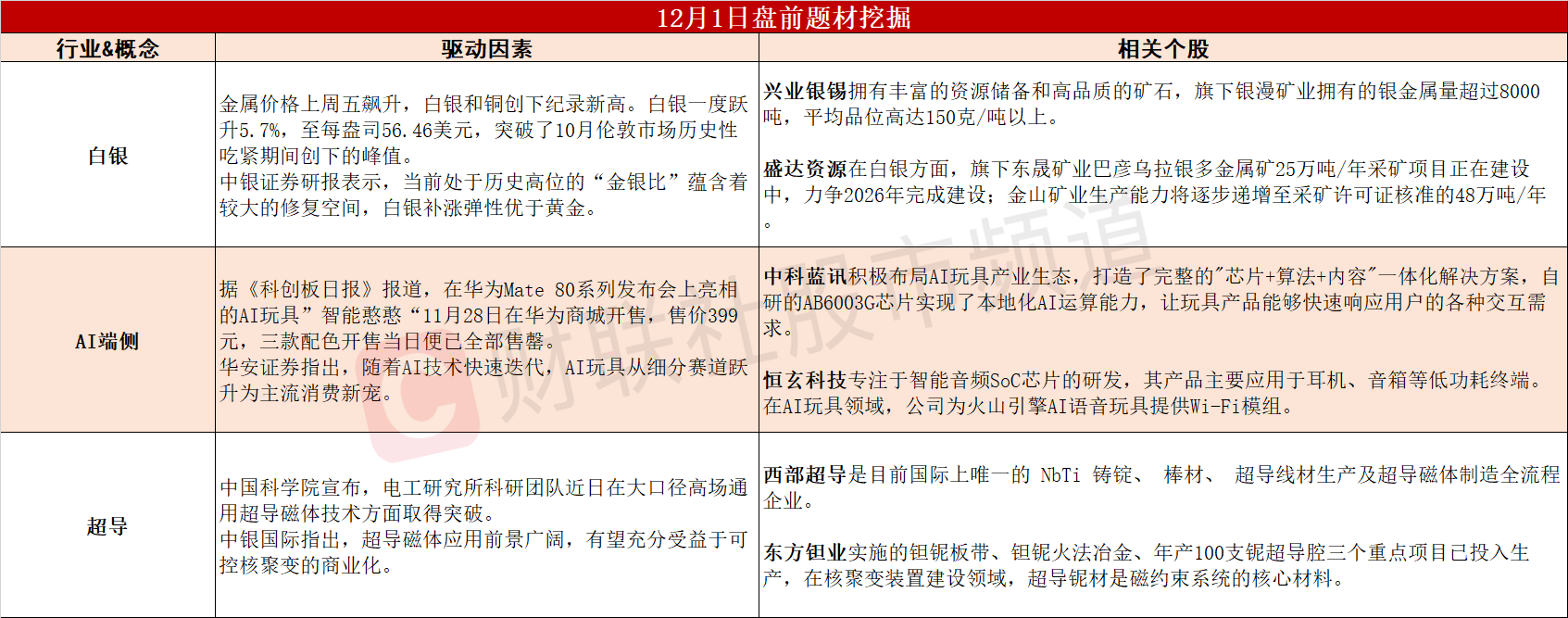 ①银价创纪录新高,机构称当前白银补涨弹性优于黄金。②华为首款AI情绪陪伴玩具售罄缺货,AI端侧赛道投资价值凸现。③我国超导磁体技术再获突破,超导材料或充分受益于核聚变商业化。