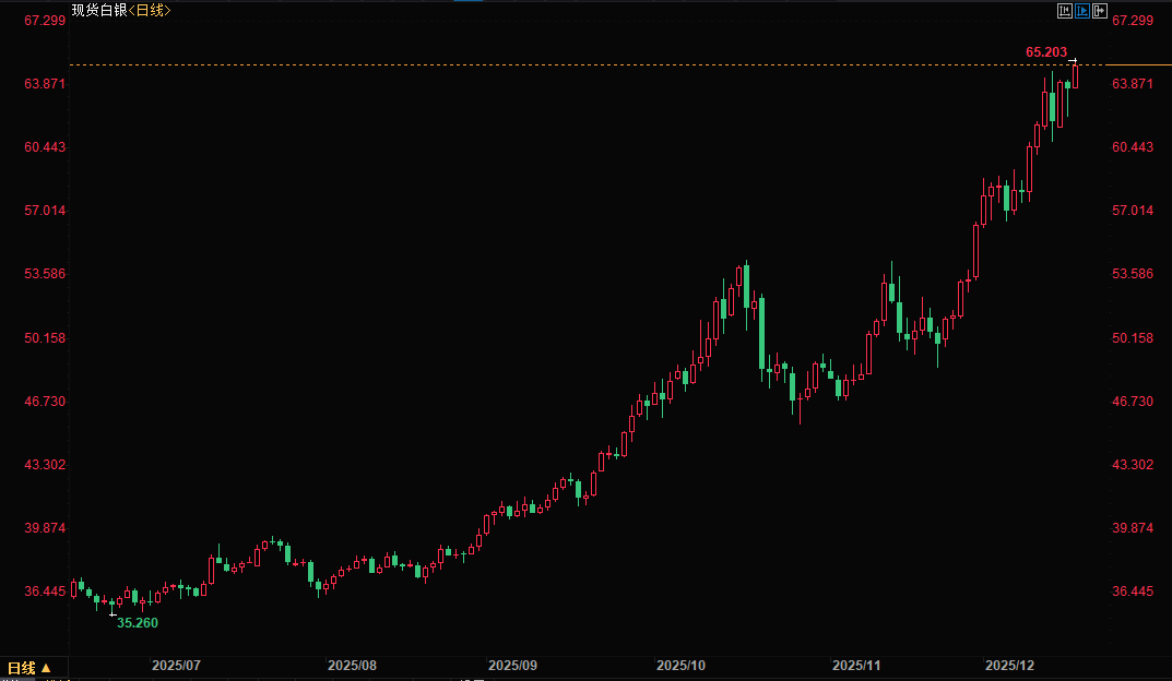 财联社12月17日电,现货白银突破前高64.658美元/盎司,再创历史新高,日内涨近2%,突破65美元/盎司。