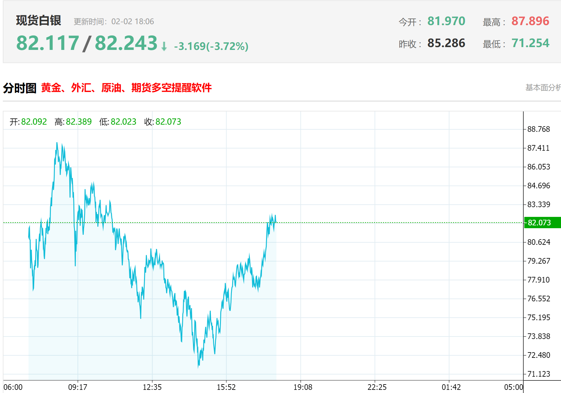 财联社2月2日电,现货白银日内跌超15%报71.5美元/盎司,较历史高位回落50美元,仅三个交易日抹平一个月涨幅。