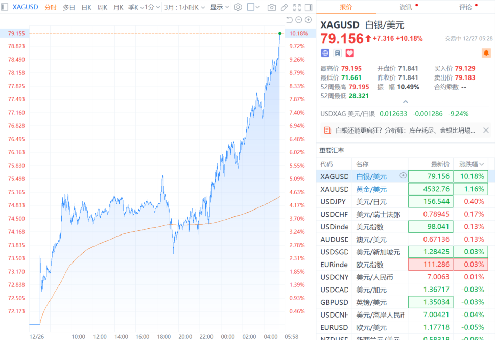财联社12月27日电,纽约银日内涨幅达10%,报78.87美元/盎司。现货白银日内涨幅达9%,报78.36美元/盎司。