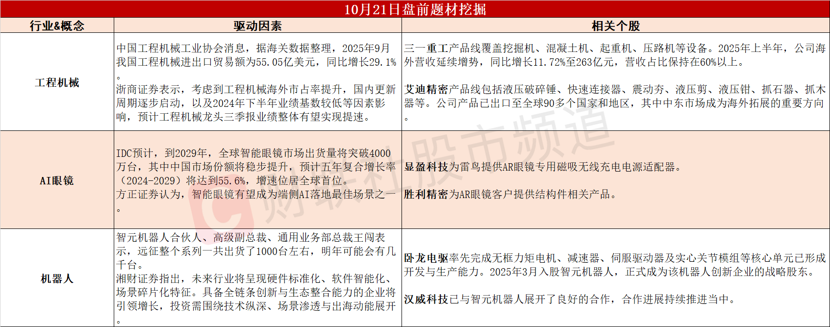 ①9月工程机械出口额同比增长29.6%,工程机械龙头三季报业绩有望提速。②五年复合增长率或将达到55.6%,我国智能眼镜市场未来潜力巨大。③智元机器人今年营收或增超10倍,产业链驶入发展“快车道”。