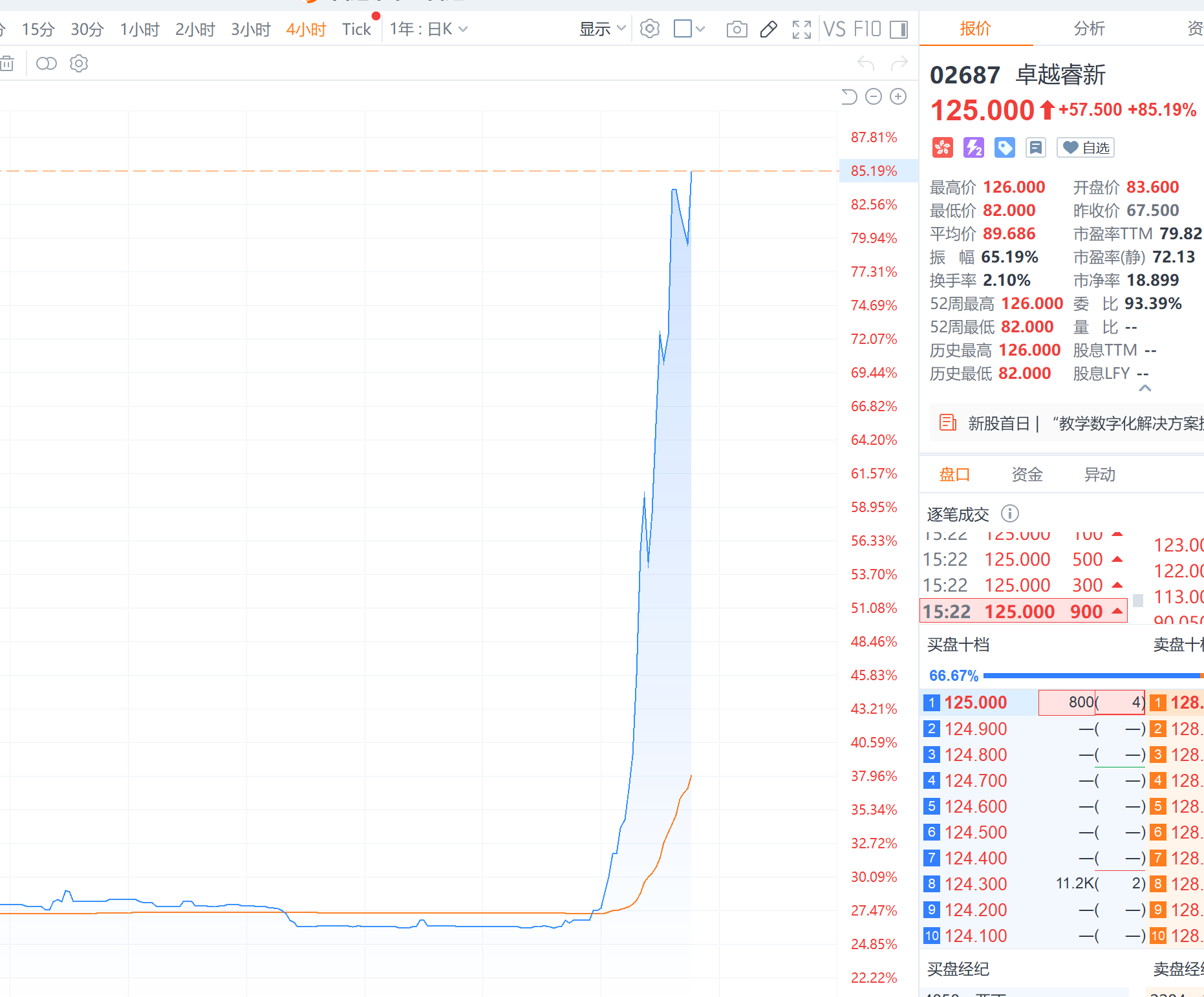 财联社12月8日电,利弗莫尔证券显示,港股新股卓越睿新尾盘涨幅扩大至85%,股价现报125港元,总市值超83亿港元。