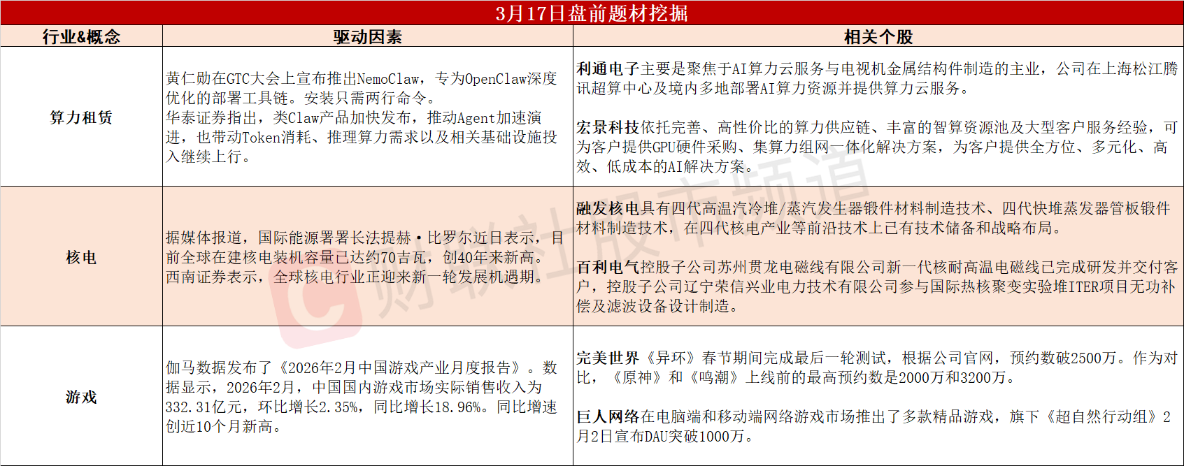 ①英伟达官方支持极简养虾,Token消耗激增或催生算力租赁热潮。②全球在建核电装机容量创40年新高,行业迎新一轮发展机遇期。③销售收入同比增速创近10个月新高,机构称游戏板块景气度将延续。