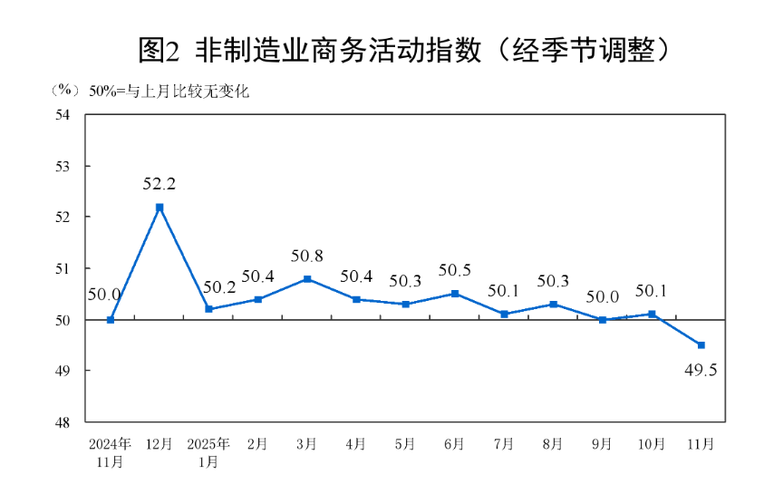 11月份,非制造业商务活动指数为49.5%,比上月下降0.6个百分点。分行业看,建筑业商务活动指数为49.6%,比上月上升0.5个百分点;服务业商务活动指数为49.5%,比上月下降0.7个百分点。从服务业行业看,铁路运输、电信广播电视及卫星传输服务、货币金融服务等行业商务活动指数均位于55.0%以上较高景气区间;房地产、居民服务等行业商务活动指数均低于临界点。