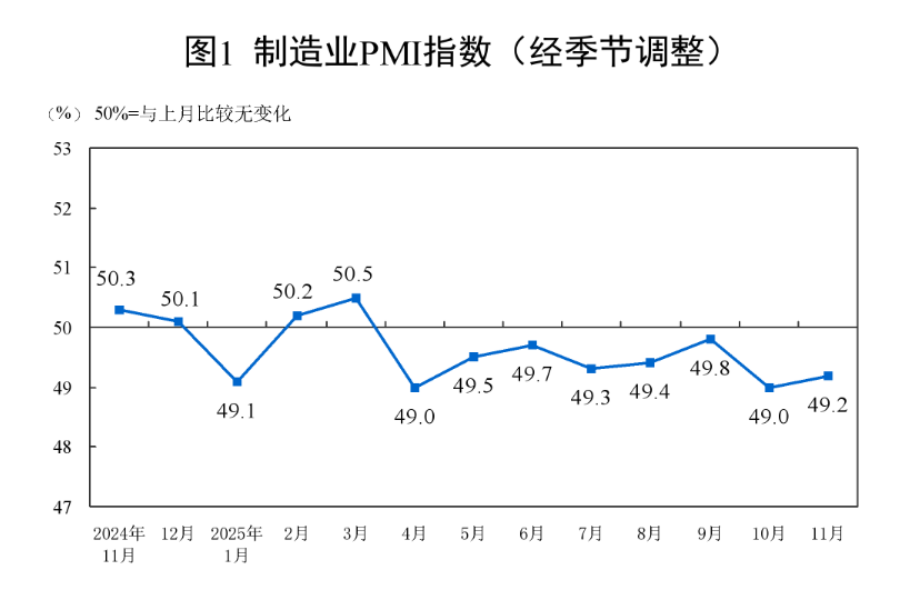 财联社11月30日电,国家统计局发布数据显示,11月份,制造业采购经理指数(PMI)为49.2%,比上月上升0.2个百分点,景气水平有所改善。从企业规模看,大型企业PMI为49.3%,比上月下降0.6个百分点,低于临界点;中、小型企业PMI分别为48.9%和49.1%,比上月上升0.2个和2.0个百分点,均低于临界点。