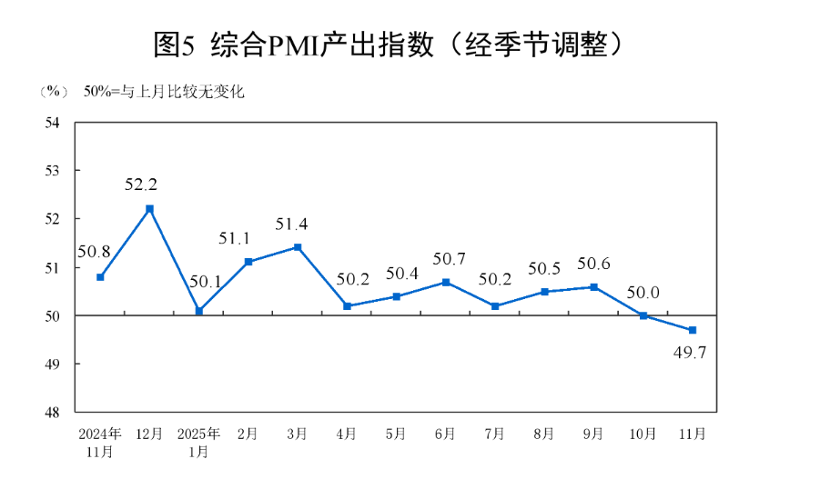 11月份,综合PMI产出指数为49.7%,比上月下降0.3个百分点。