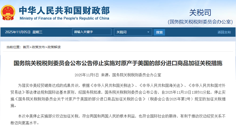 财联社11月5日电,为落实中美经贸磋商达成的成果共识,根据《中华人民共和国关税法》、《中华人民共和国海关法》、《中华人民共和国对外贸易法》等法律法规和国际法基本原则,经国务院批准,国务院关税税则委员会公布公告,自2025年11月10日13时01分起,停止实施《国务院关税税则委员会关于对原产于美国的部分进口商品加征关税的公告》(税委会公告2025年第2号)规定的加征关税措施。
