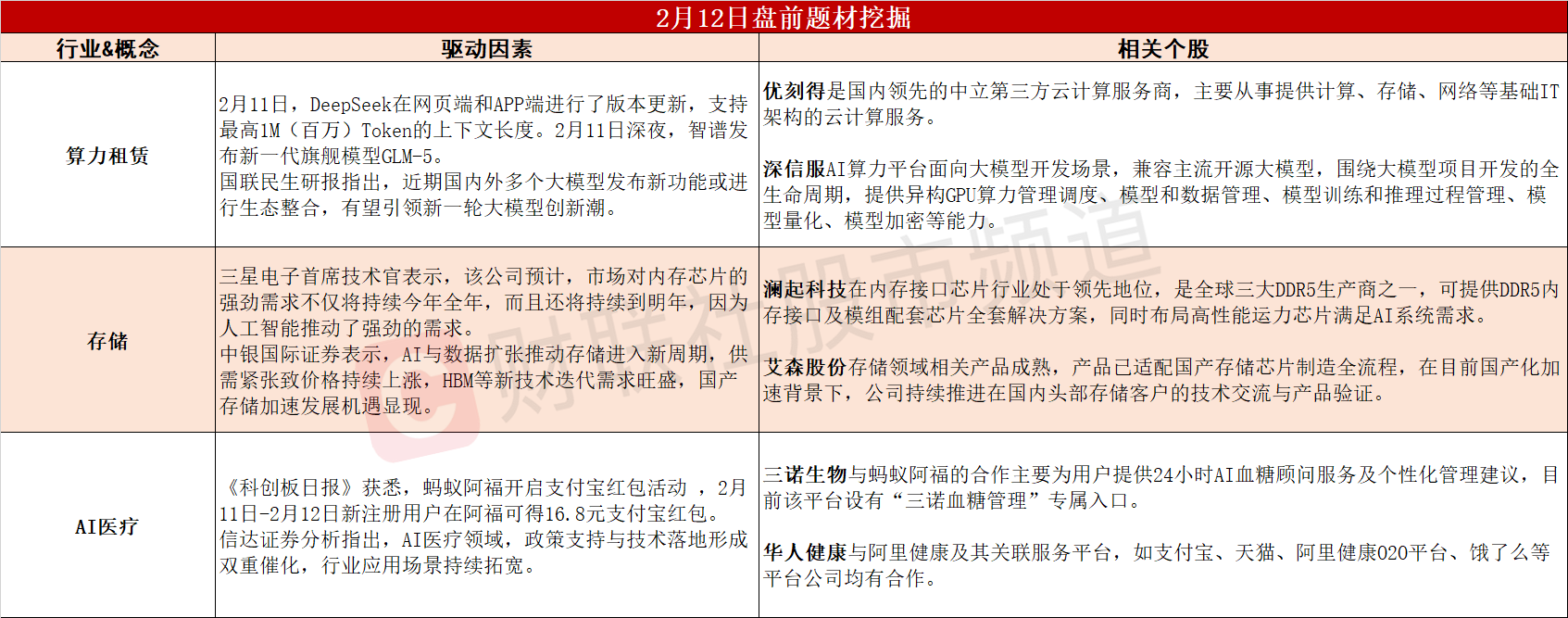 ①国产大模型密集上新,AI算力景气度与确定性依然可期。②内存强劲需求料持续到2027年,机构称国产存储加速发展机遇显现。③蚂蚁阿福开启春节支付宝红包活动,AI医疗行业有望再度站上风口。