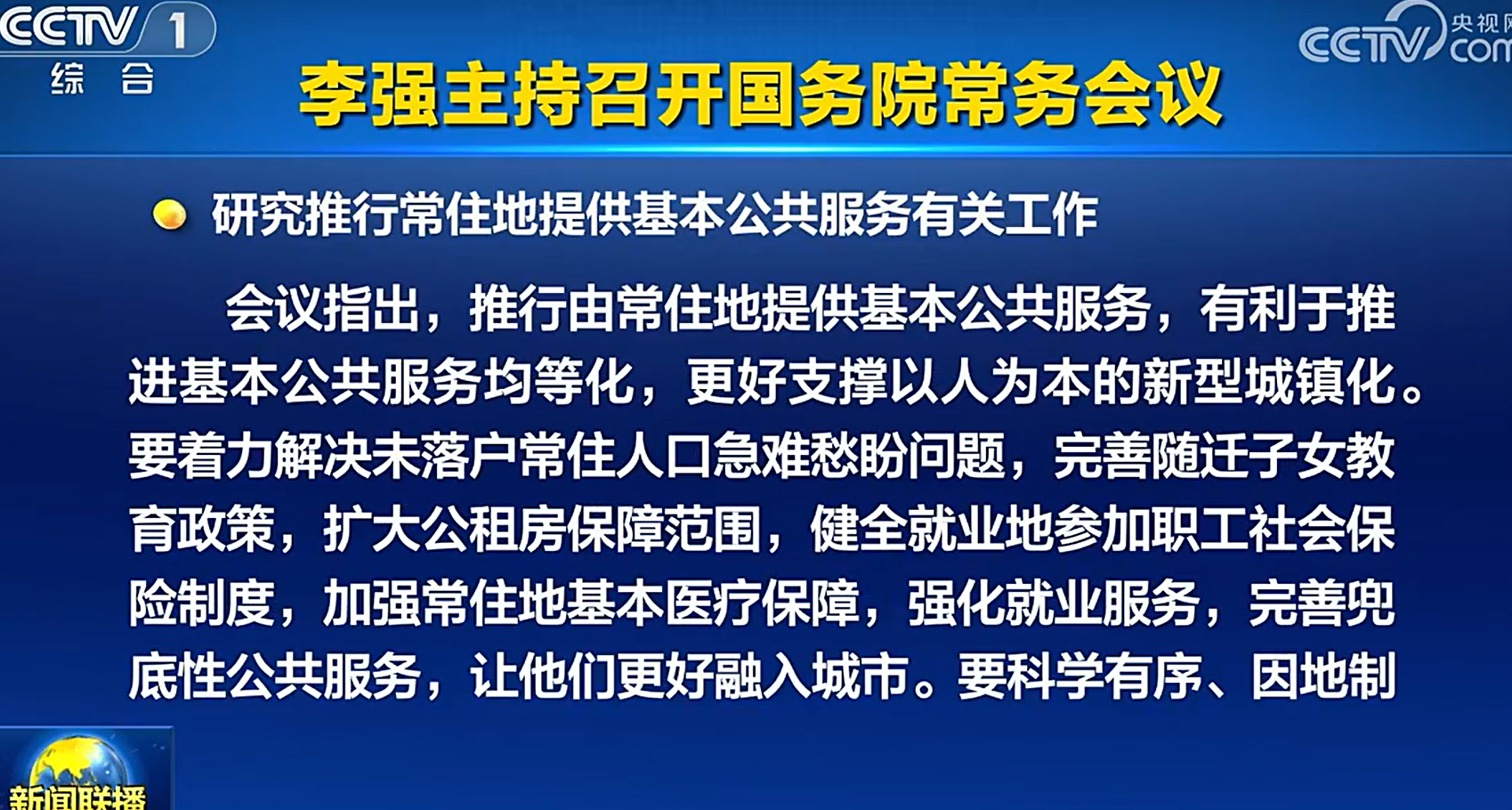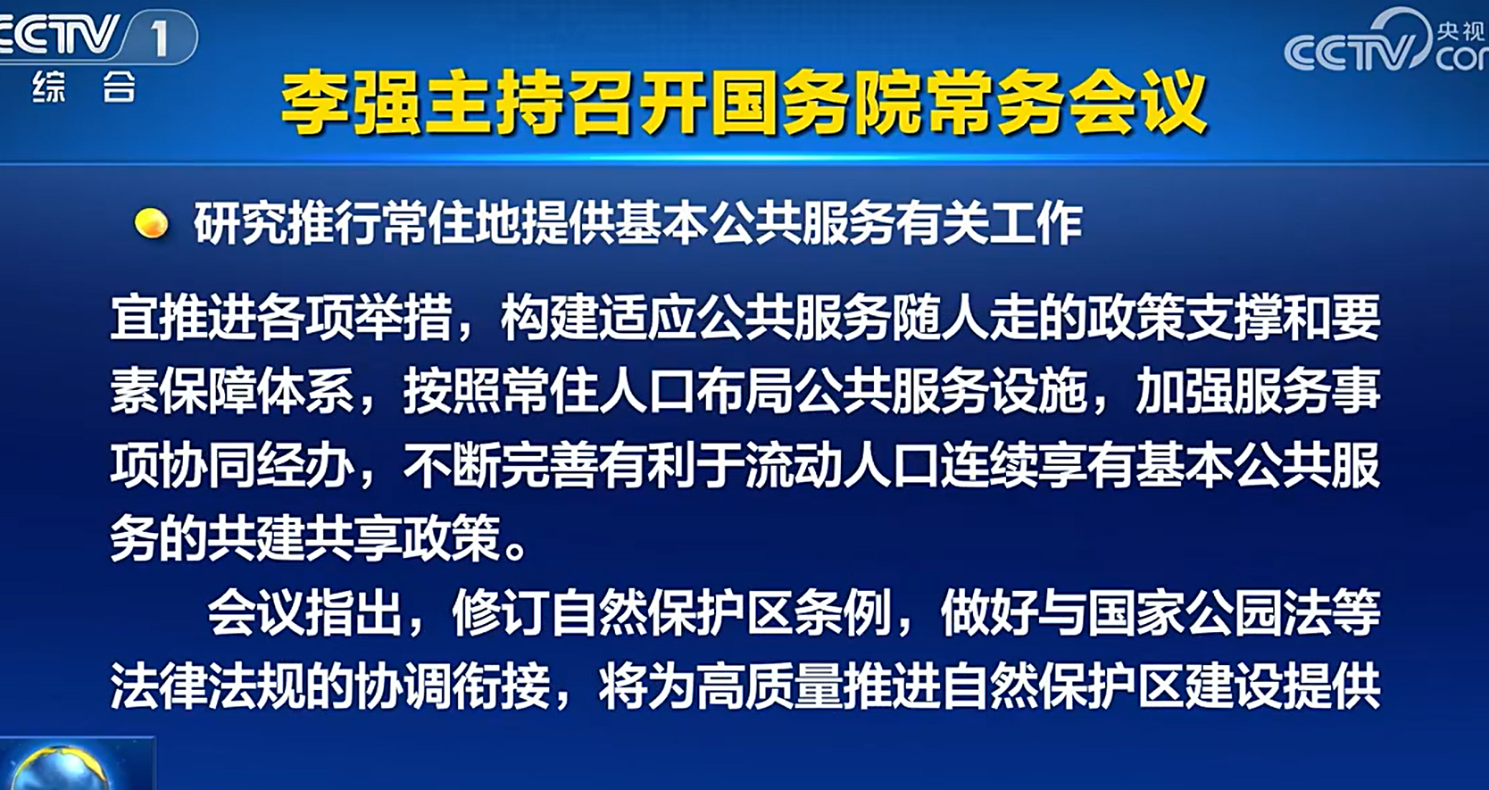 财联社1月9日电,据央视新闻,国务院总理李强1月9日主持召开国务院常务会议,部署实施财政金融协同促内需一揽子政策,研究推行常住地提供基本公共服务有关工作,审议通过《中华人民共和国自然保护区条例(修订草案)》。会议指出,推行由常住地提供基本公共服务,有利于推进基本公共服务均等化,更好支撑以人为本的新型城镇化。要着力解决未落户常住人口“急难愁盼”问题,完善随迁子女教育政策,扩大公租房保障范围,健全就业地参加职工社会保险制度,加强常住地基本医疗保障,强化就业服务,完善兜底性公共服务,让他们更好融入城市。要科学有序、因地制宜推进各项举措,构建适应公共服务随人走的政策支撑和要素保障体系,按照常住人口布局公共服务设施,加强服务事项协同经办,不断完善有利于流动人口连续享有基本公共服务的共建共享政策。