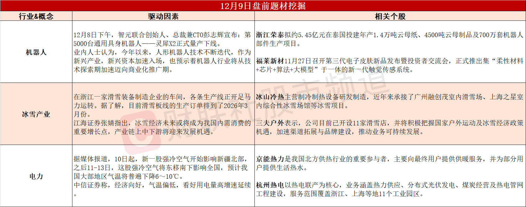 ①智元机器人量产已超5000台,机器人行业加速商业化落地。②生产订单排到明年3月,我国冰雪经济快速升温。③新一轮寒潮即将到来,机构看好用电量高增速延续。