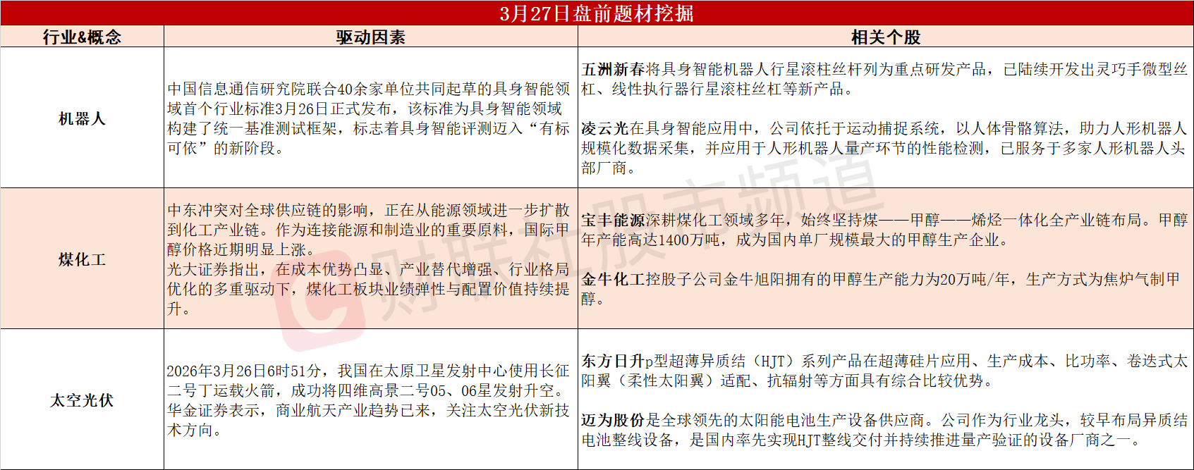 ①具身智能领域首个行业标准发布,机器人产业链或爆发在即。②中东冲突影响扩散到化工产业链,煤化工板块业绩弹性有望释放。③商业航天产业趋势已来,太空光伏新技术方向有望突围。