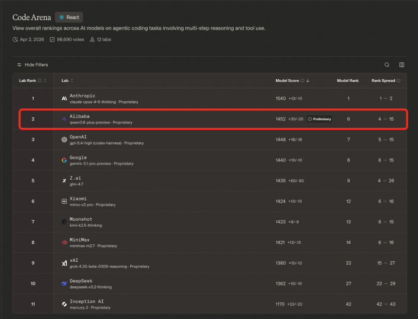 财联社4月3日电,4月3日,全球知名大模型盲测榜单LMArena旗下聚焦AI编程能力的Code Arena公布新一期排名,阿里巴巴最新一代大语言模型Qwen 3.6-Plus登上全球榜单第二,超越OpenAI、Google、xAI等国际巨头,成为该榜单上排名最高的中国大模型。Qwen3.6-Plus是阿里于4月2日最新发布的新一代大语言模型,拥有原生多模态理解、推理能力,并在代码生成与Agent能力上表现突出。榜单数据显示,千问3.6得分仅次于Anthropic旗下的Claude-Opus-4.6-Thinking(1540分),以4分优势领先OpenAI最新发布的GPT-5.0-High(1448分),并以12分差距超越Google的Gemini 3.1 Pro Preview(1440分)。据悉,Qwen3.6-Plus是阿里千问3.6推出的第一款模型,后续千问3.6系列还将开源其他尺寸模型,性能更强的旗舰模型Qwen3.6-Max也将于近期发布。