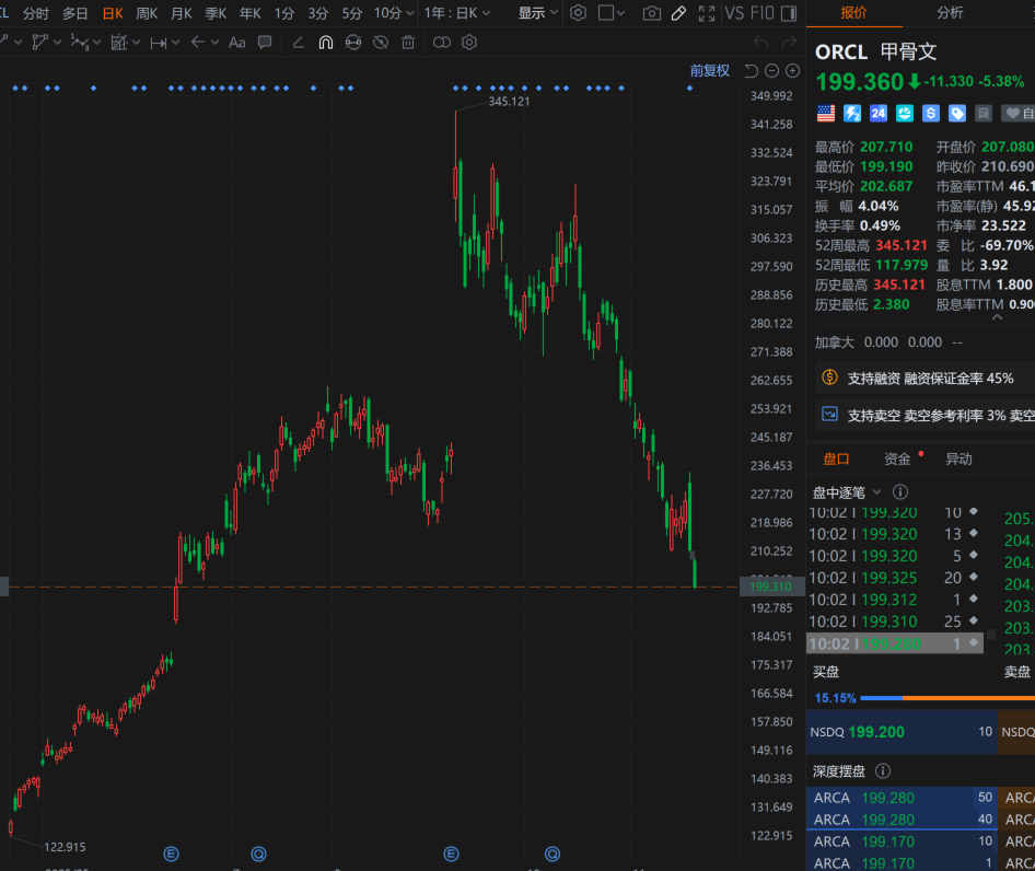 财联社11月21日电,甲骨文股价跌幅扩大至5%,创6月以来新低,股价自9月高点已跌去42%。