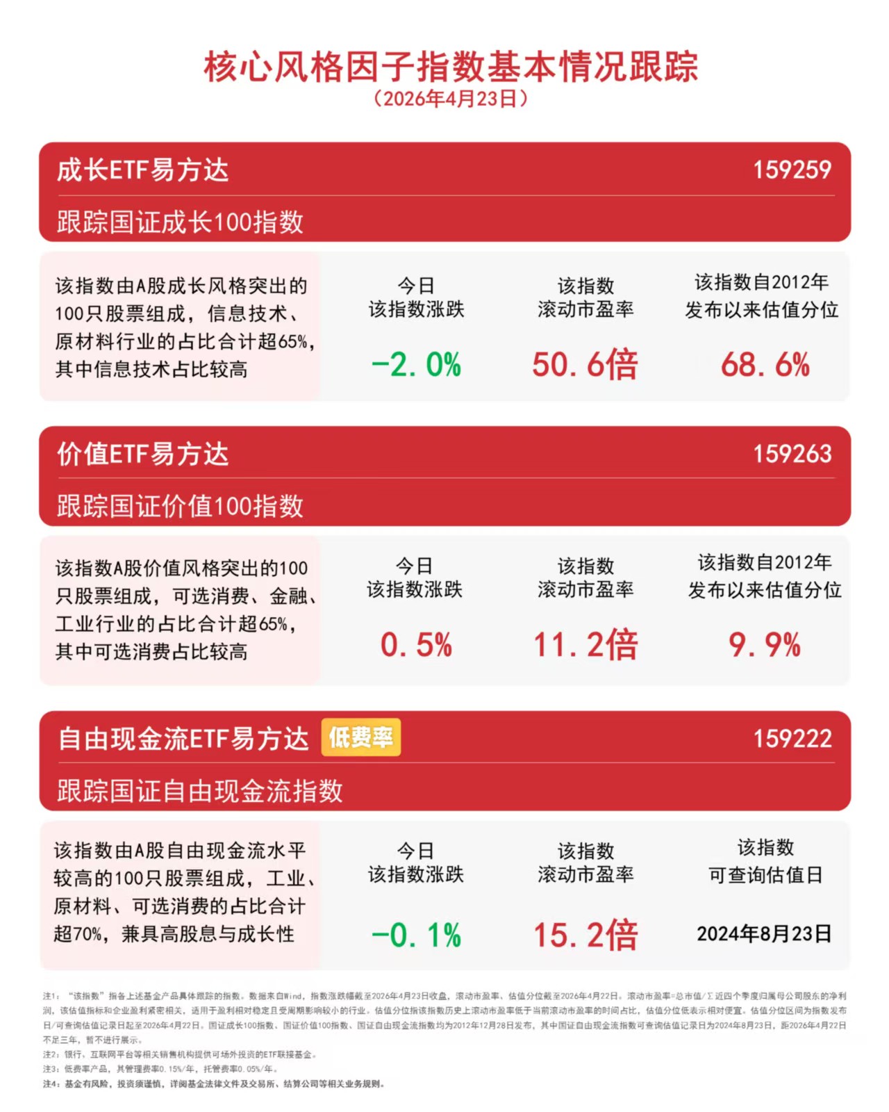 4月23日,市场高开低走,通信设备、半导体等科技成长方向承压,截至收盘,国证价值100指数上涨0.5%,国证自由现金流指数下跌0.1%,国证成长100指数下跌2.0%。Wind数据显示,截至昨日,成长ETF易方达(159259)连续8个交易日获资金净流入,合计4.6亿元。