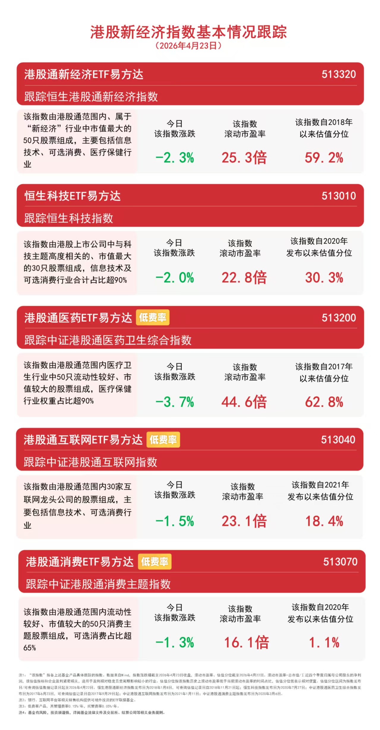 4月23日,港股延续调整。截至收盘,中证港股通消费主题指数下跌1.3%,中证港股通互联网指数下跌1.5%,恒生科技指数下跌2.0%,恒生港股通新经济指数下跌2.3%,中证港股通医药卫生综合指数下跌3.7%。相关ETF中,恒生科技ETF易方达(513010,联接基金A/C:013308/013309)昨日“吸金”超2亿元。