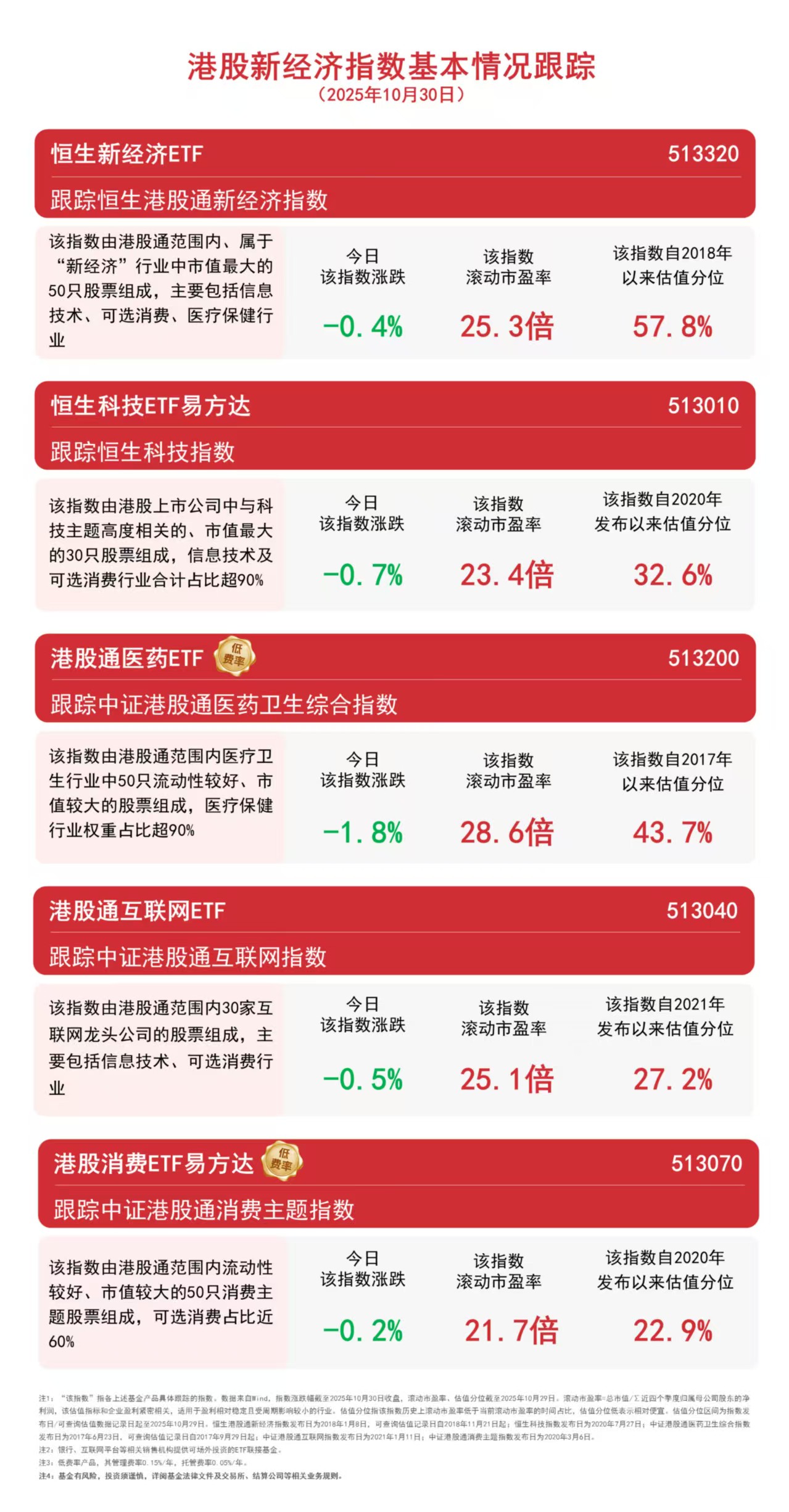 截至收盘,中证港股通消费主题指数下跌0.2%,恒生港股通新经济指数下跌0.4%,中证港股通互联网指数下跌0.5%,恒生科技指数下跌0.7%,中证港股通医药卫生综合指数下跌1.8%。相关产品备受资金青睐,Wind数据显示,截至昨日,港股通互联网ETF(513040)、恒生科技ETF易方达(513010)近一个月合计净流入分别达29.5亿元和21.0亿元。