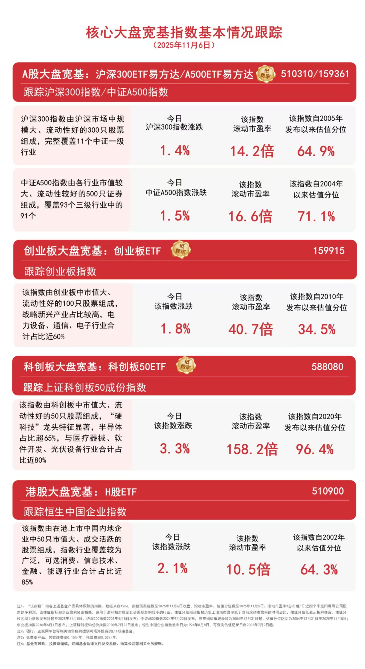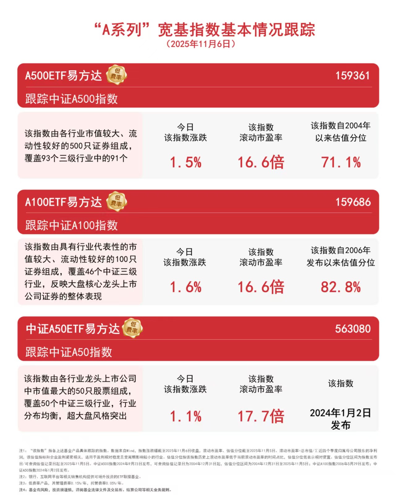 A500ETF易方达(159361)、科创板50ETF(588080)、创业板ETF(159915)分别跟踪以上指数,且均实行ETF中最低一档0.15%/年的管理费率,可助力投资者构建攻守兼备的投资组合。