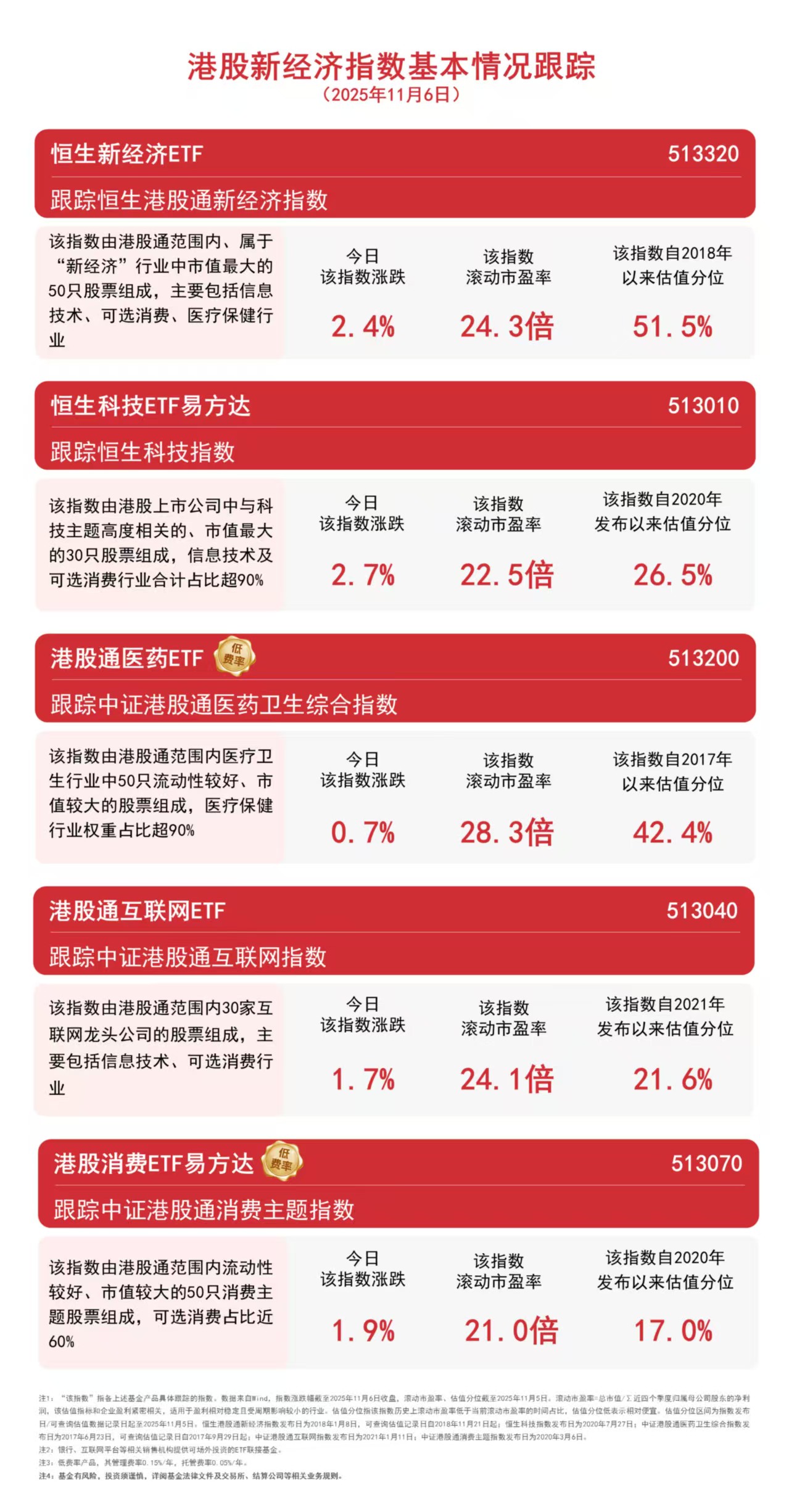 今日港股板块集体大涨,半导体和互联网龙头涨幅居前,医药板块尾盘发力,截至收盘,恒生科技指数上涨2.7%,恒生港股通新经济指数上涨2.4%,中证港股通消费主题指数上涨1.9%,中证港股通互联网指数上涨1.7%,中证港股通医药卫生综合指数上涨0.7%。Wind数据显示,截至昨日,恒生科技ETF易方达(513010)、港股通互联网ETF(513040)均连续5个交易日获净流入,分别合计约10亿元和3亿元。