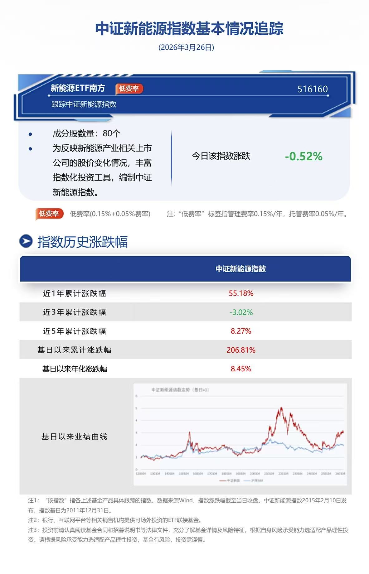 截至2026年3月26日收盘,新能源ETF南方(516160)换手6.98%,成交5.36亿元,跟踪标的指数中证新能源指数(399808.SZ) 跌0.52%。