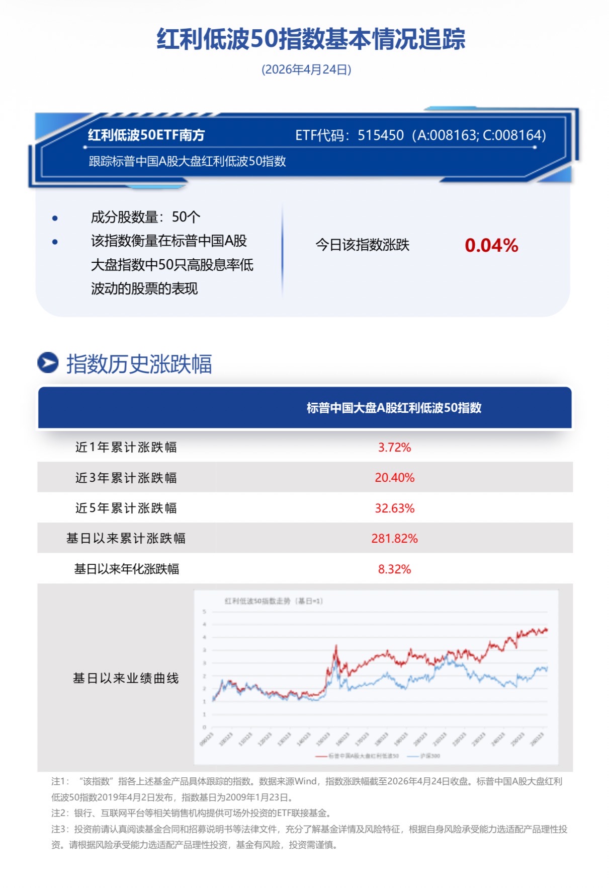 截至2026年4月24日收盘,红利低波50ETF南方(515450)换手0.52%,成交0.89亿元,跟踪标的指数标普中国A股大盘红利低波50指数(SPCLLHCP.SPI) 涨0.04%。
