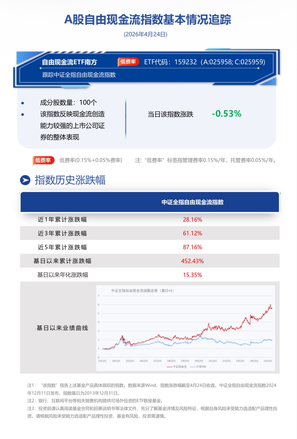 截至2026年4月24日收盘,自由现金流ETF南方(159232)换手5.67%,成交2.39亿元,跟踪标的指数中证全指自由现金流指数(932365.CSI) 跌-0.53%。中证自由现金流指数资金端表现亮眼,自由现金流ETF南方今日净申购3600万份,且已连续5日收获资金净流入,前4日资金累计净流入规模达1.22亿元,场内布局意愿持续升温。当市场从预期交易转向基本面交易,现金流优质企业往往更容易获得资金关注。自由现金流能够较好刻画企业经营确定性和财务稳健程度,也能反映其应对外部扰动的能力。自由现金流ETF南方(159232)以指数化方式聚焦此类优质资产,帮助投资者在更重视业绩验证的环境中,把握现金流逻辑下的长期配置机会。