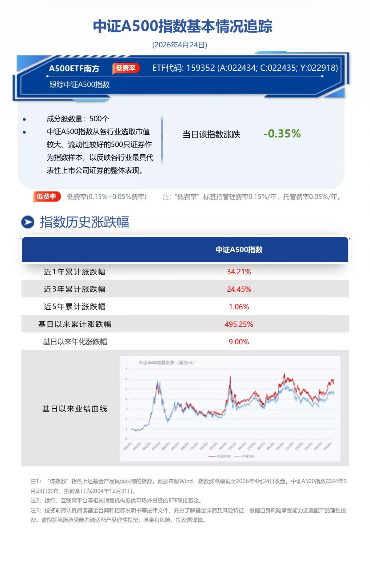 截至2026年4月24日收盘,A500ETF南方(159352)换手17.41%,成交57.41亿元,跟踪标的指数中证A500指数(000510.SH) 跌-0.35%。