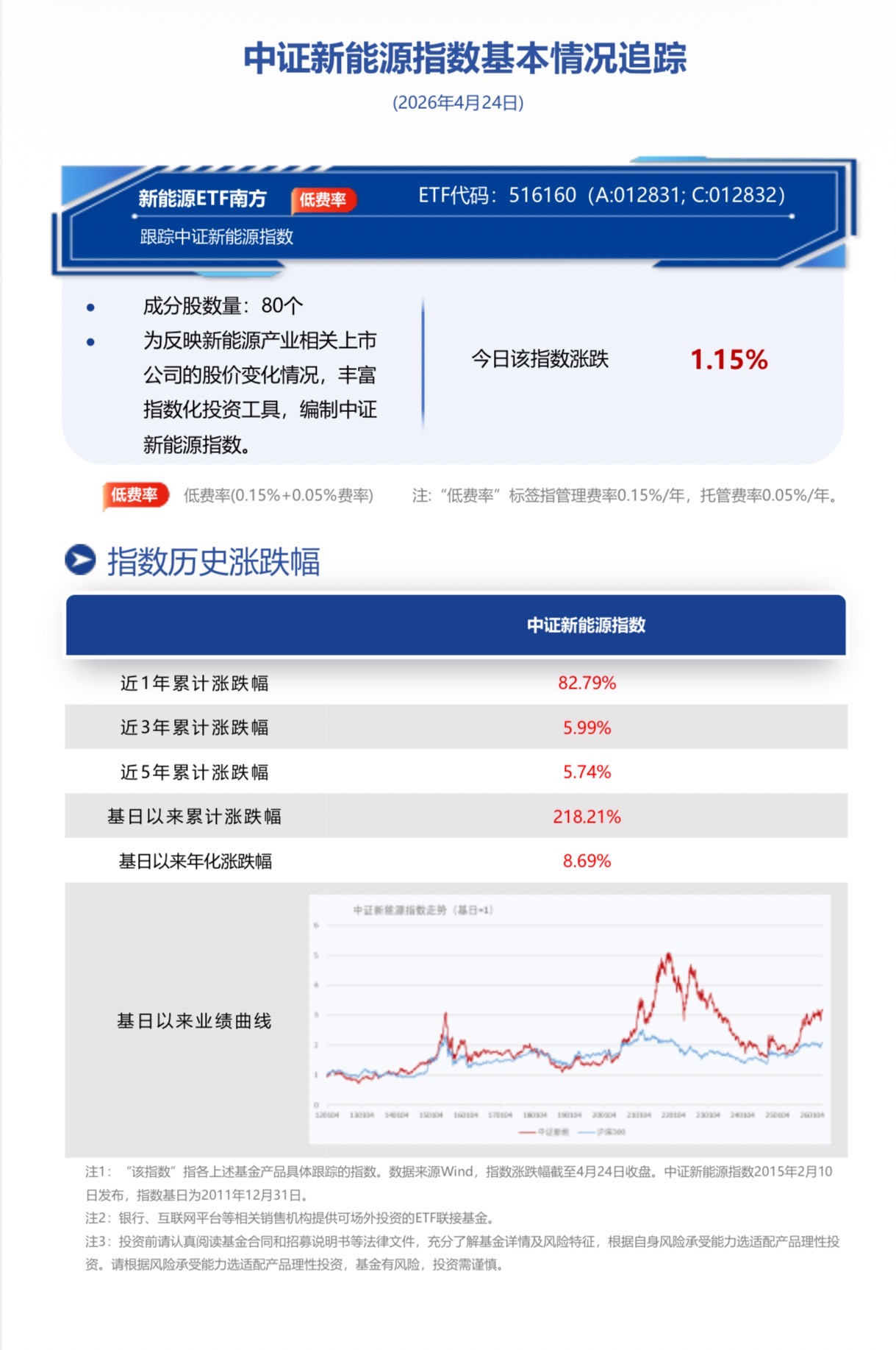 截至2026年4月24日收盘,新能源ETF南方(516160)换手3.47%,成交2.67亿元,跟踪标的指数中证新能源指数(399808.SZ) 涨1.15%。