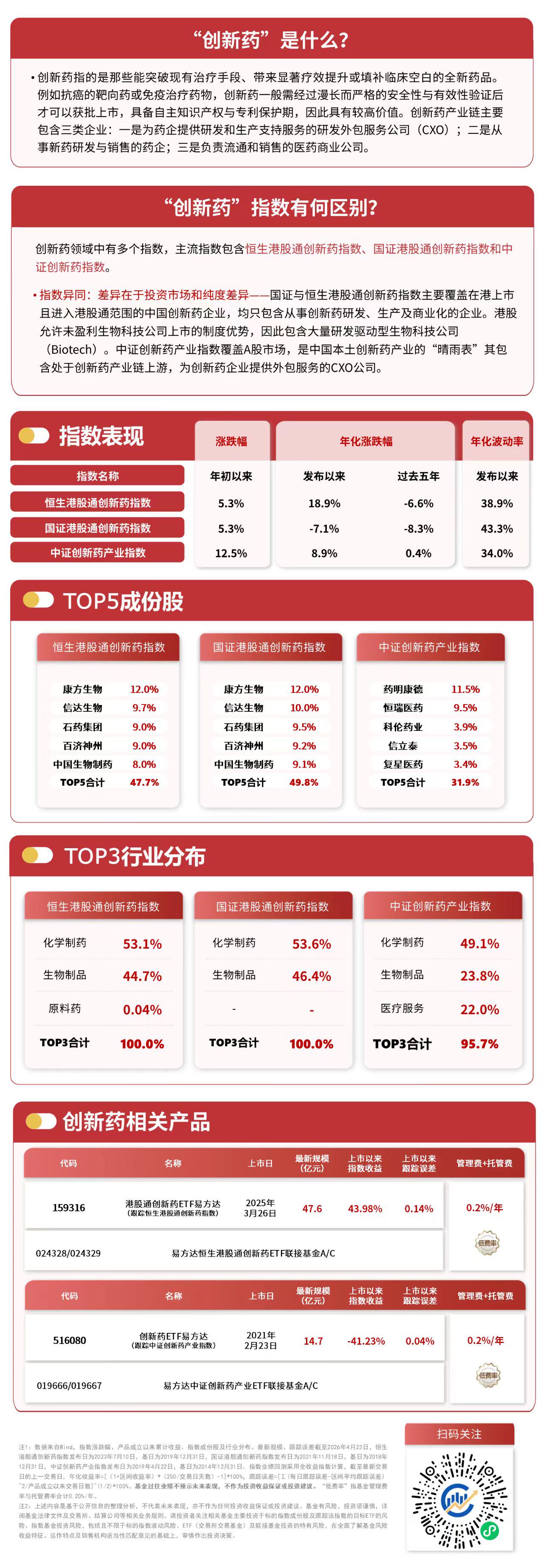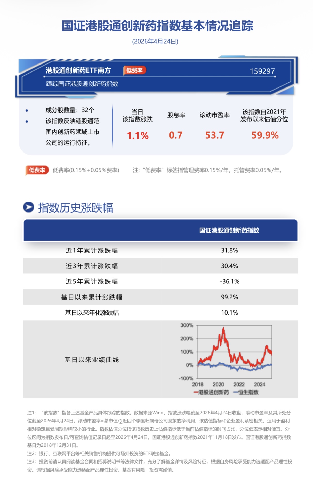 机构认为,中国创新药产业正从"研发蓄力期"迈向"价值兑现期",出海已成为明确的长期产业趋势。港股市场汇聚了大量采用18A规则上市的未盈利生物科技公司以及已实现商业化的创新药龙头,是捕捉中国创新药全球化机遇的核心战场。港股通创新药ETF南方(159297)紧密跟踪国证港股通创新药指数,作为投资港股创新药板块的便捷工具,产业趋势明确,长期投资价值凸显,0.15%/年的管理费低费率优势,可助力投资者低成本布局港股创新药核心资产。