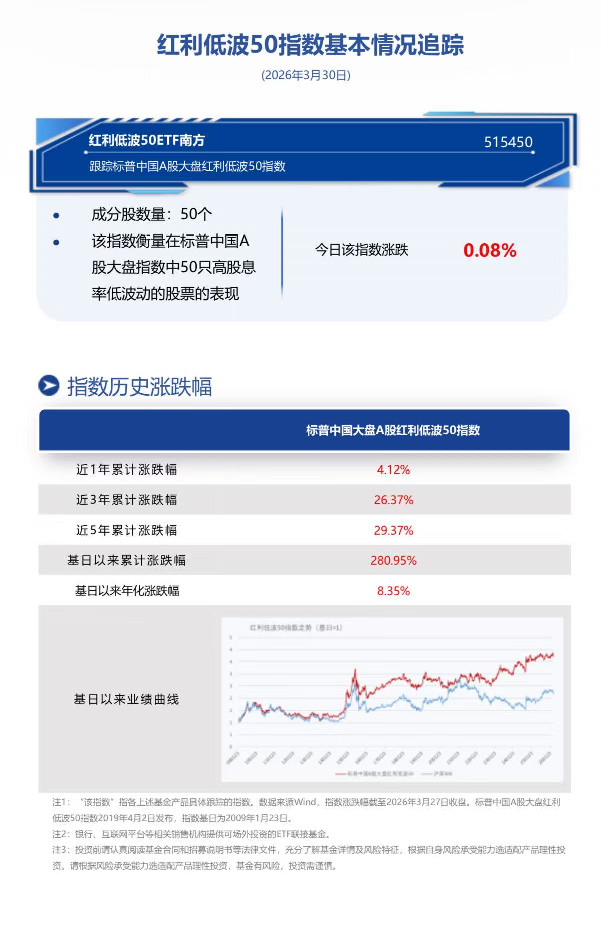 红利低波50ETF南方(515450.SH)跟踪标普中国A股大盘红利低波50指数,指数编制过程中在样本空间、行业分类等方面具备独特性,相比同类指数行业分布更加均衡、超配电力及大消费板块,长期风险收益表现领先。截至2026年3月27日,据Wind,红利低波50股息率按整体法计算为4.53%,红利低波50股息性价比仍存。