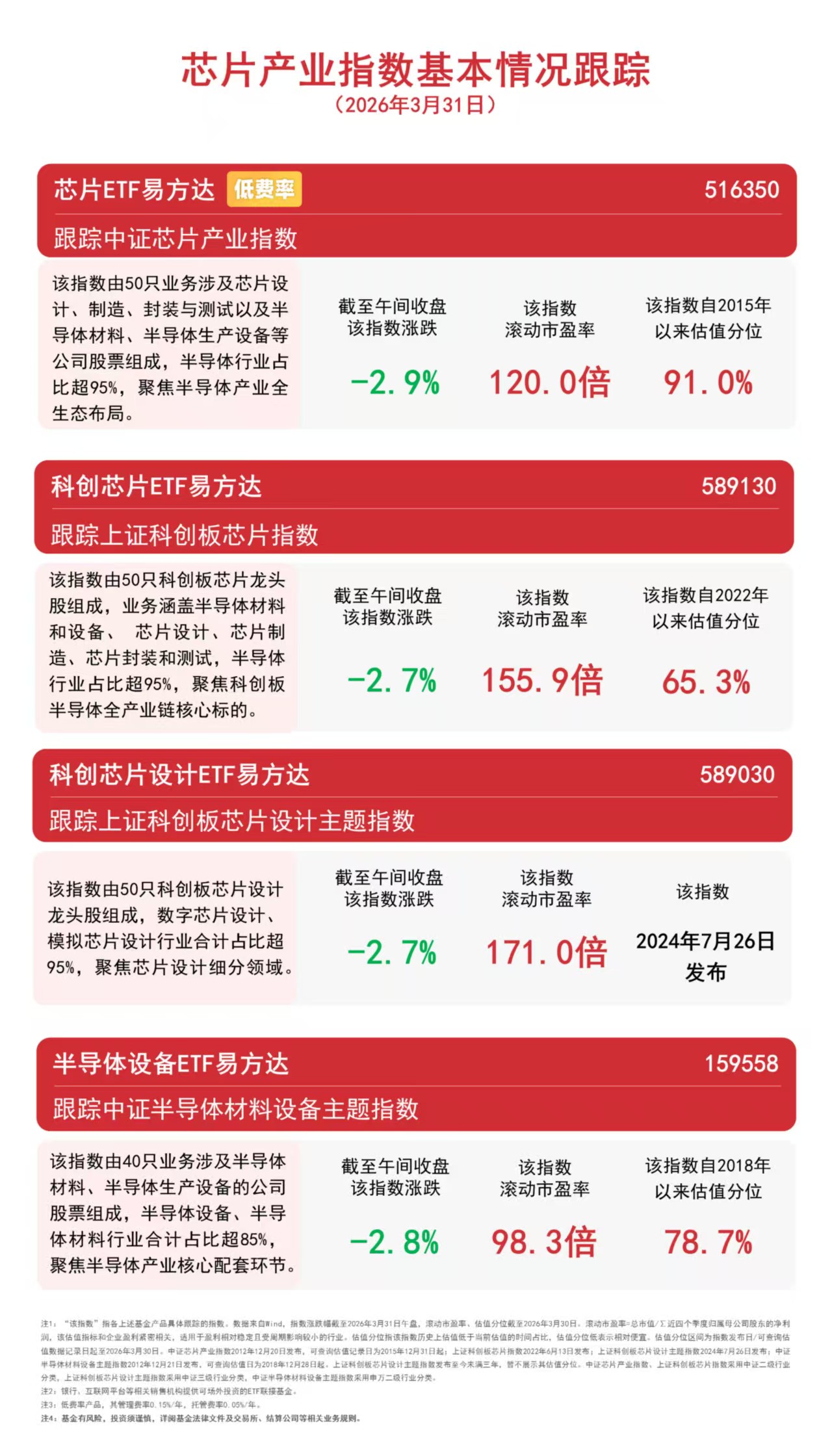 截至午间收盘,上证科创板芯片指数、上证科创板芯片设计主题指数均下跌2.7%,中证半导体材料设备主题指数下跌2.8%,中证芯片产业指数下跌2.9%,半导体设备ETF易方达(159558,联接基金A/C:021893/021894)半日净申购达1300万份。