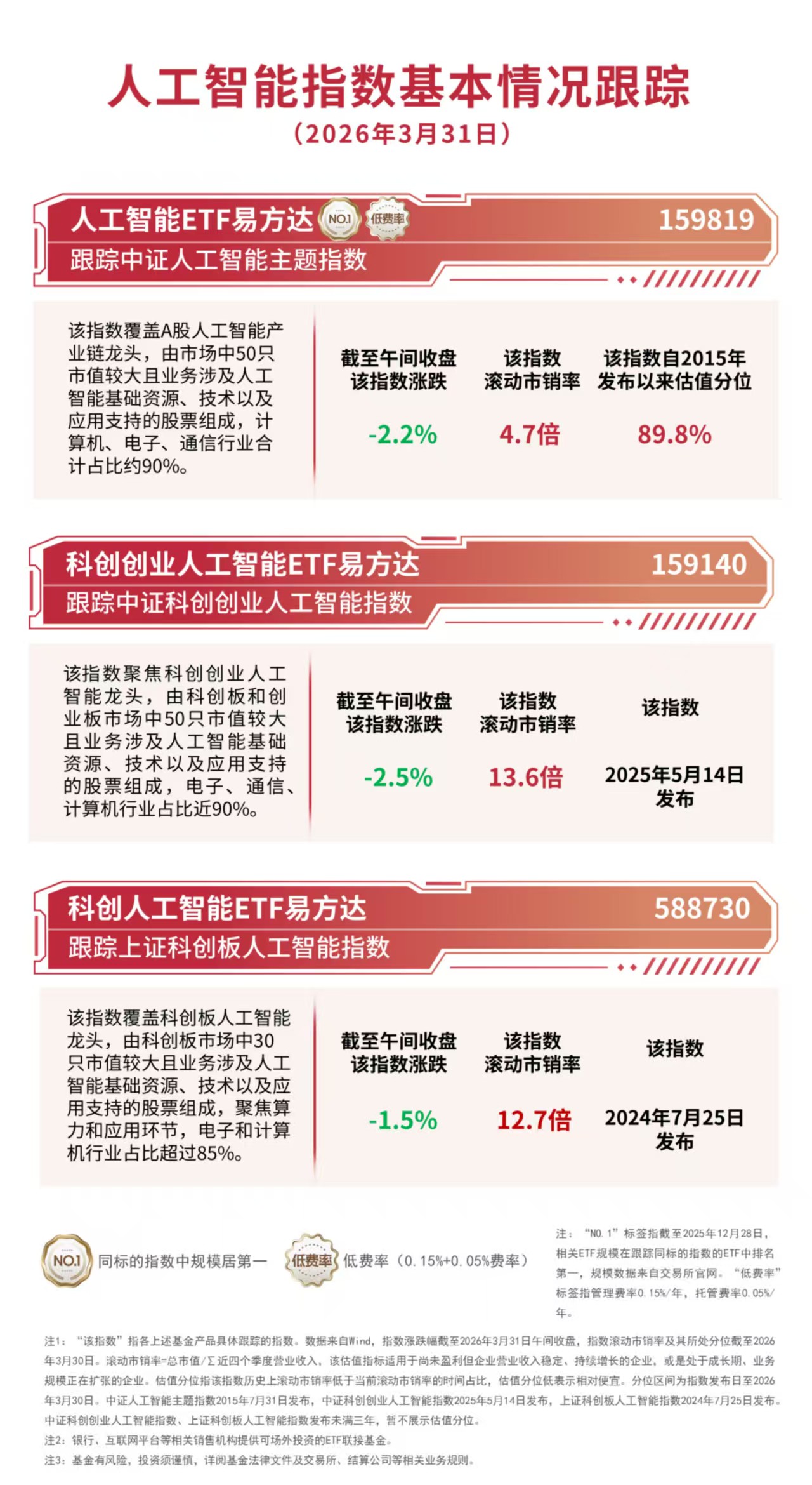 截至午间收盘,上证科创板人工智能指数下跌1.5%,中证人工智能主题指数下跌2.2%,中证科创创业人工智能指数下跌2.5%,资金逆势布局,人工智能ETF易方达(159819,联接A/C:012733/012734)和科创创业人工智能ETF易方达(159140)半日净申购分别达2800万份和600万份。