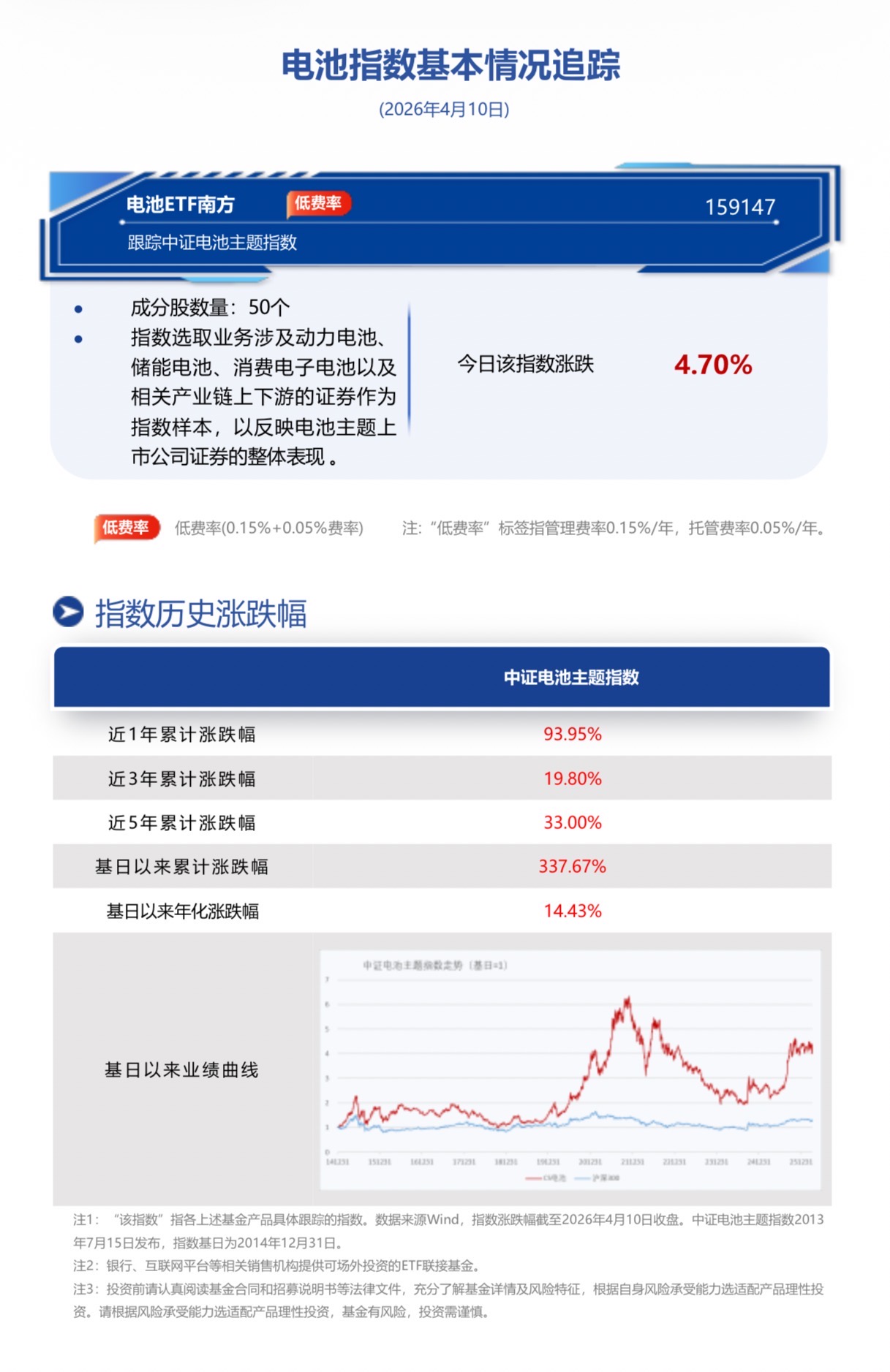 截至2026年4月10日收盘,电池ETF南方(159147)换手3.32%,成交0.55亿元,跟踪标的指数中证电池主题指数(931719)大涨4.7%。