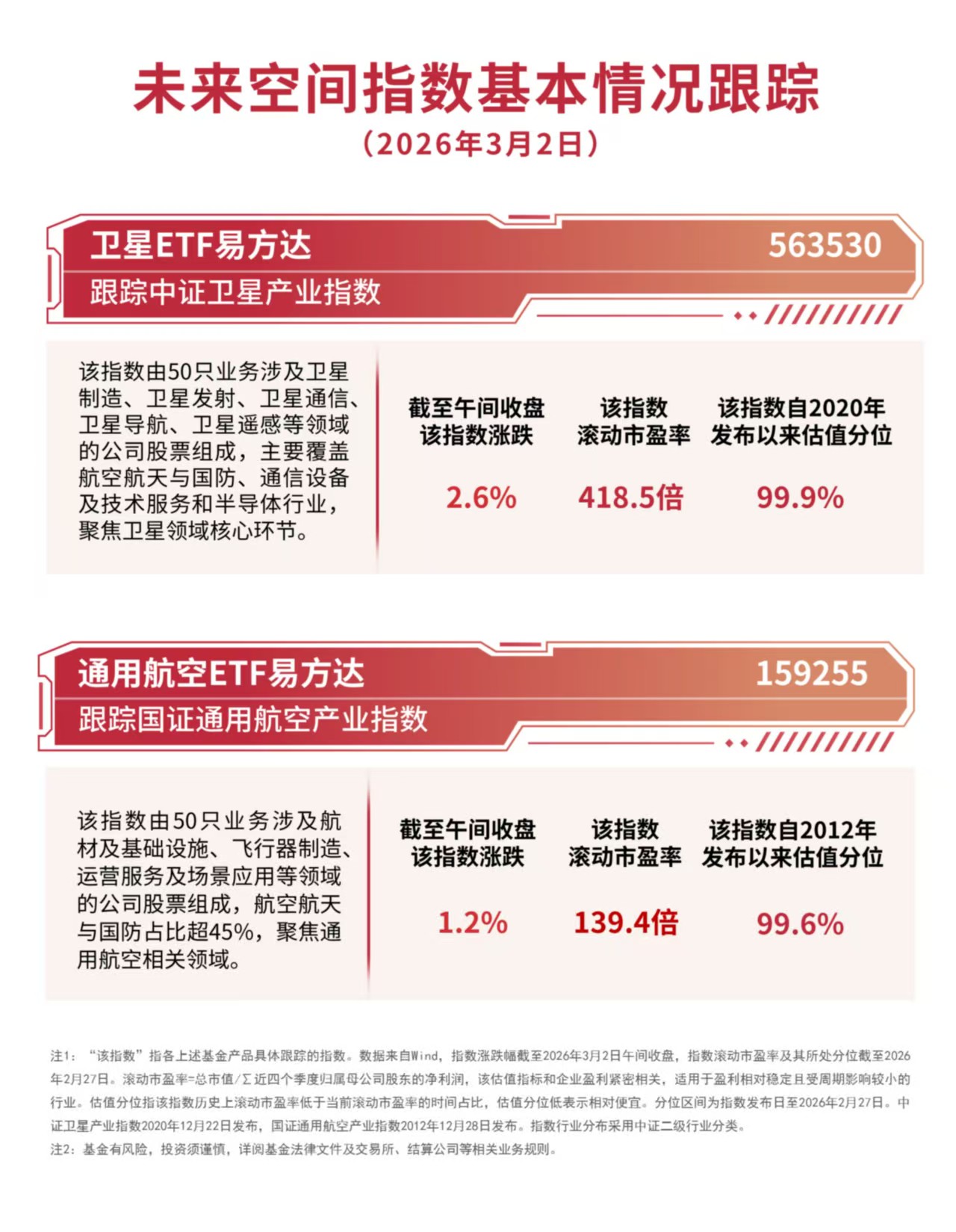 卫星ETF易方达(563530)跟踪的中证卫星产业指数选取50只覆盖卫星制造、发射、应用等领域的上市公司作为指数样本,成份股涉及卫星制造、发射、应用等全产业链环节,具有产业链覆盖广、龙头集中度高、应用端占比高等特点,有望充分受益于产业上行贝塔,助力投资者把握商业航天未来发展机遇。