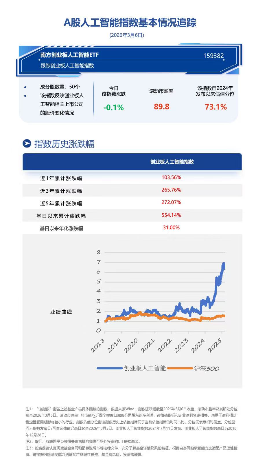 创业板人工智能ETF南方(159382)紧密跟踪创业板人工智能指数,创业板人工智能指数反映创业板人工智能主题相关上市公司的股价变化情况。指数前十大权重股分别为中际旭创、新易盛、天孚通信、润泽科技、蓝色光标、协创数据、昆仑万维、北京君正、网宿科技、润和软件。