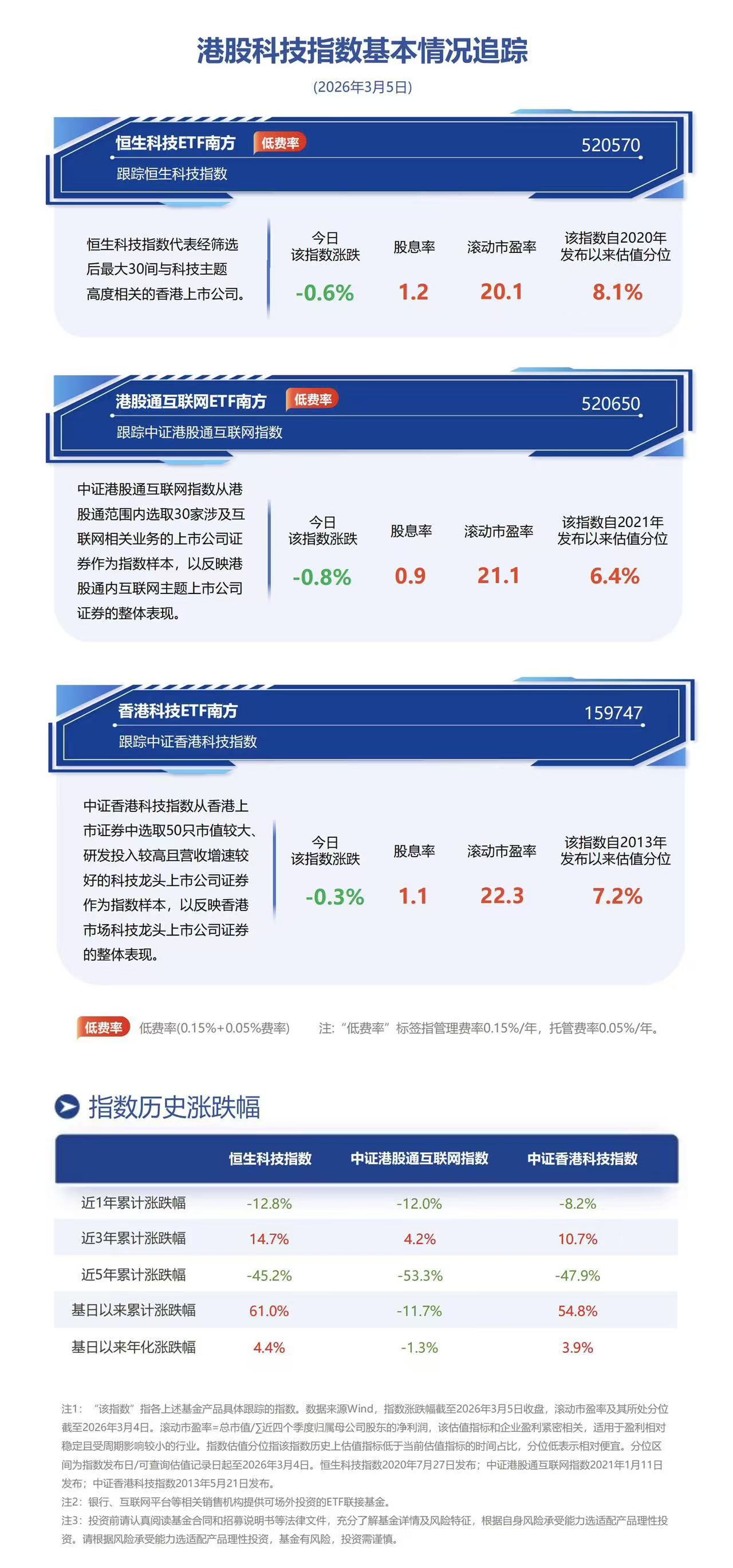 截至2026年3月5日收盘,恒生科技ETF南方(520570)换手5.01%,成交1.35亿元。港股通互联网ETF南方(520650)换手16.69%,成交5409.28万元,市场交投活跃。香港科技ETF南方(159747)换手15.23%,成交7447.15万元,市场交投活跃。