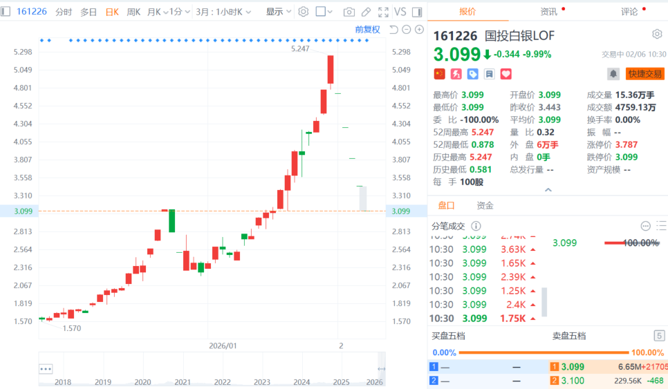 财联社2月6日电,国投白银LOF复牌再度跌停,现报3.099元,溢价率回落至28.73%。截至目前,国投白银LOF已连续第五日跌停。