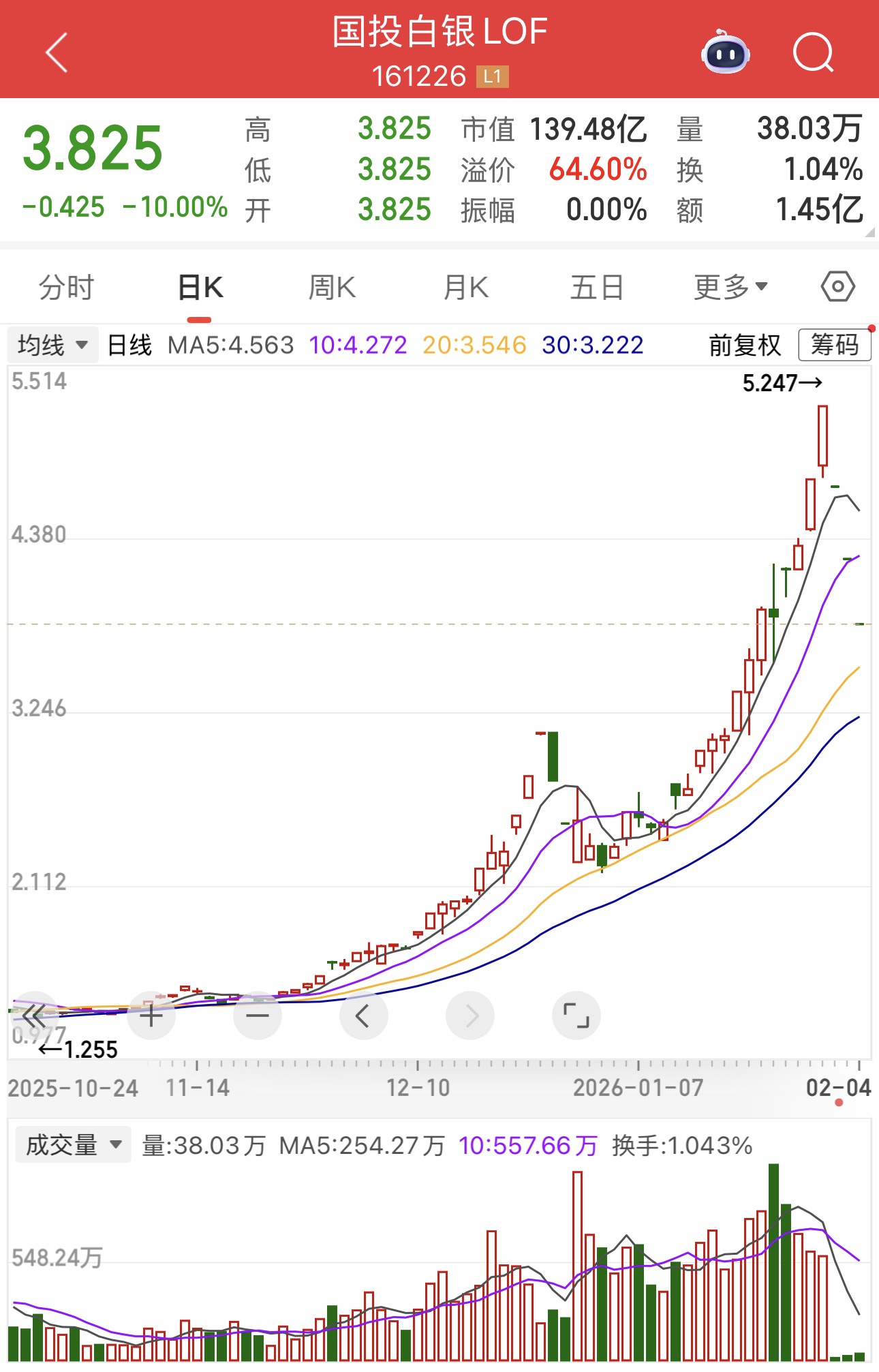 财联社2月4日电,国投白银LOF(161226)今日复牌再度跌停,报3.825元,最新溢价率为64.6%。
