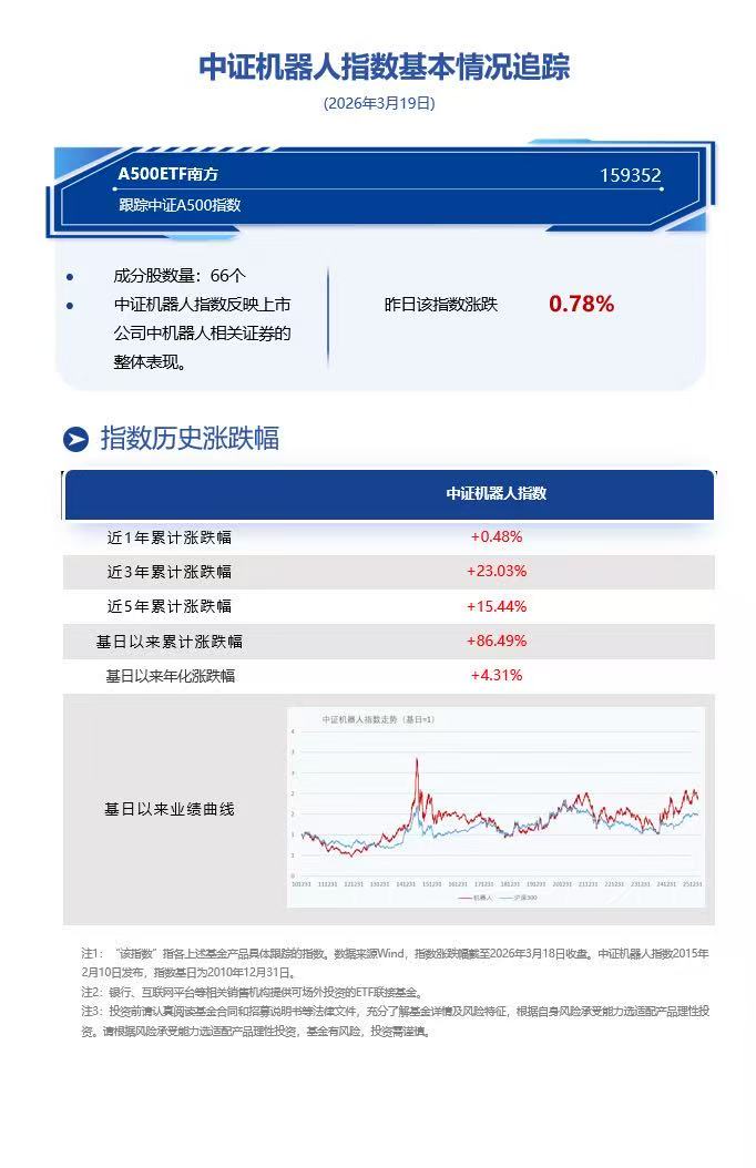 截至2026年3月18日收盘,机器人ETF南方(159258)换手1.88%,成交0.33亿元,跟踪指数中证机器人指数(H30590)涨0.78%。