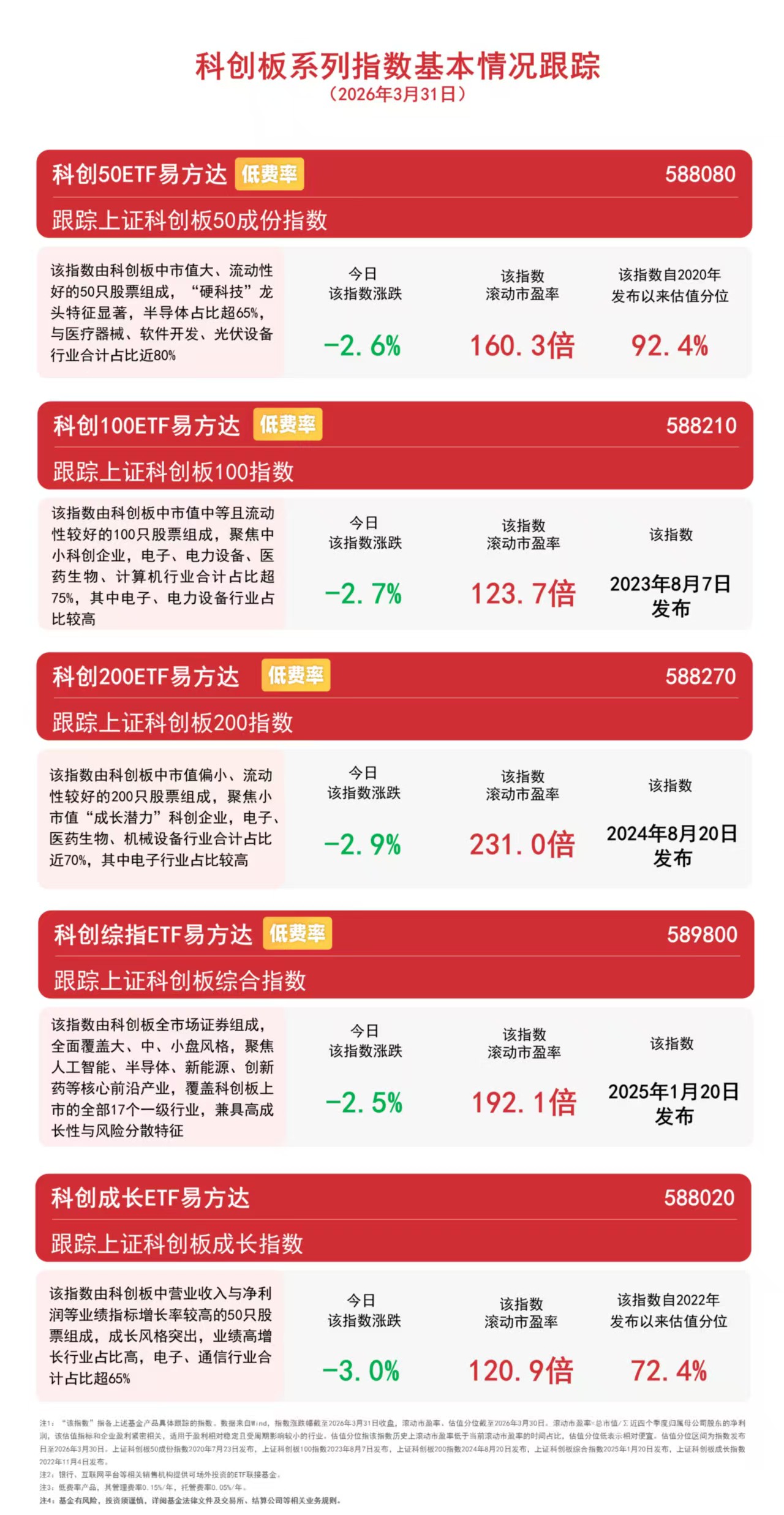 截至收盘,科创综指下跌2.5%,科创50指数下跌2.6%,科创100指数下跌2.7%,科创200指数下跌2.9%,科创成长指数下跌3.0%。Wind数据显示,截至昨日,科创50ETF易方达(588080,联接基金A/C/Y:011608/011609/022895)连续3个交易日获资金净流入,合计超4亿元。