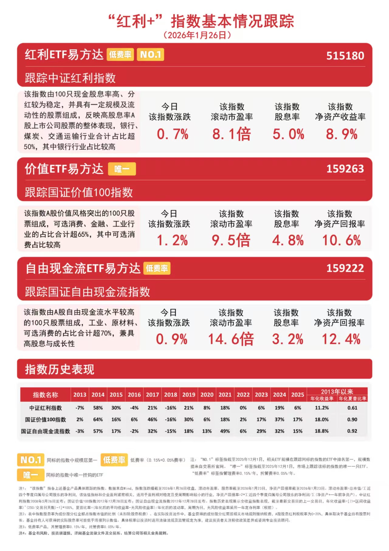 1月26日,大盘震荡调整,板块题材上,有色、石化、银行股逆势走强,带动“红利+”指数上涨。截至收盘,国证价值100指数上涨1.2%,国证自由现金流指数上涨0.9%、已连续6日上涨,中证红利指数上涨0.7%,价值ETF易方达(159263)和自由现金流ETF易方达(159222)全天分别获2400万份和3600万份净申购。拉长时间来看,这两只ETF上一周均连续5个交易日获资金布局。