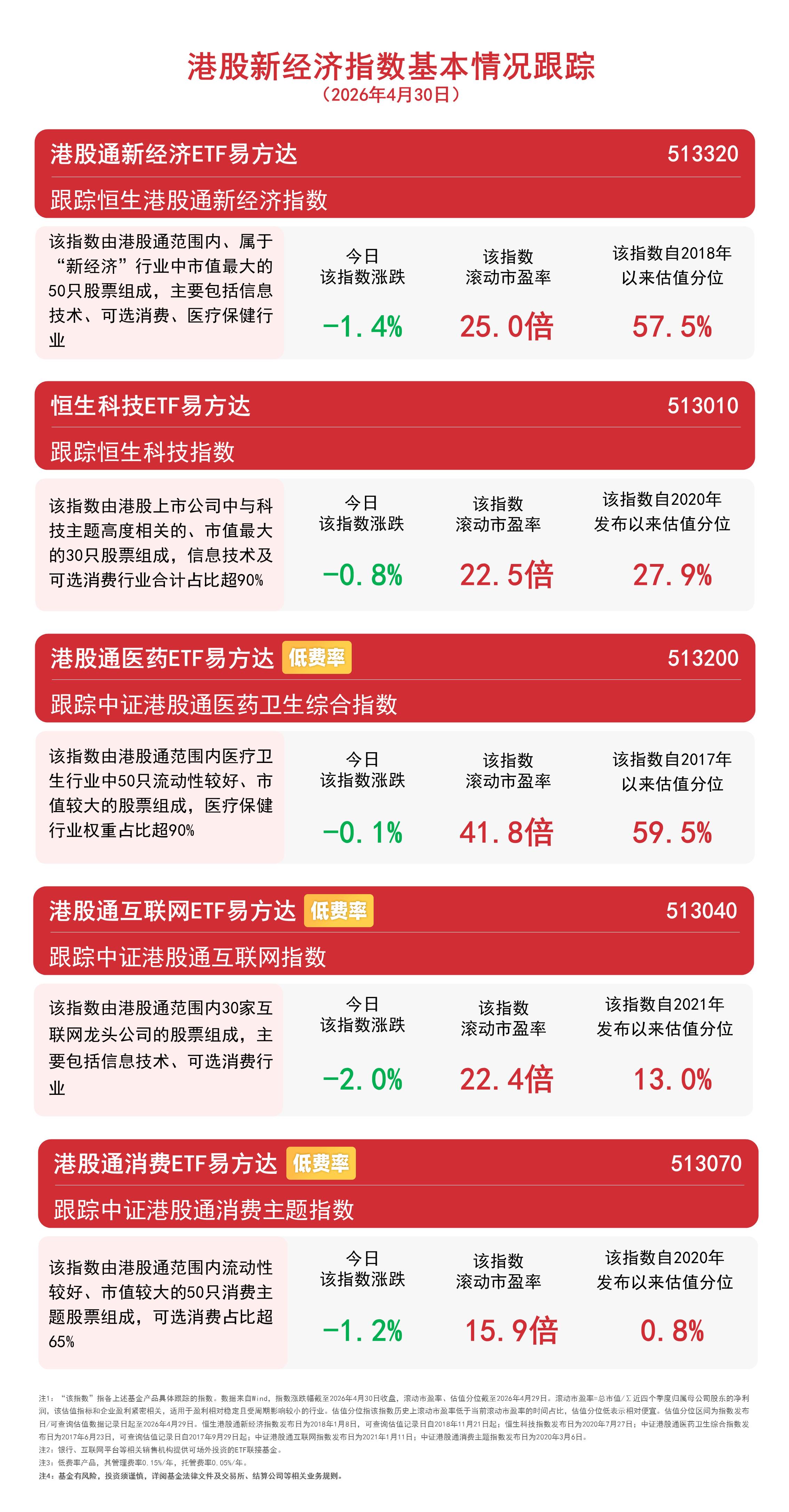 截止本周四收盘,恒生科技ETF南方(520570)跟踪标的本周跌0.63%;港股通互联网ETF南方(520650)跟踪标的本周跌3.38%;港股通创新药ETF南方(159297)跟踪标的本周跌2.31%。
