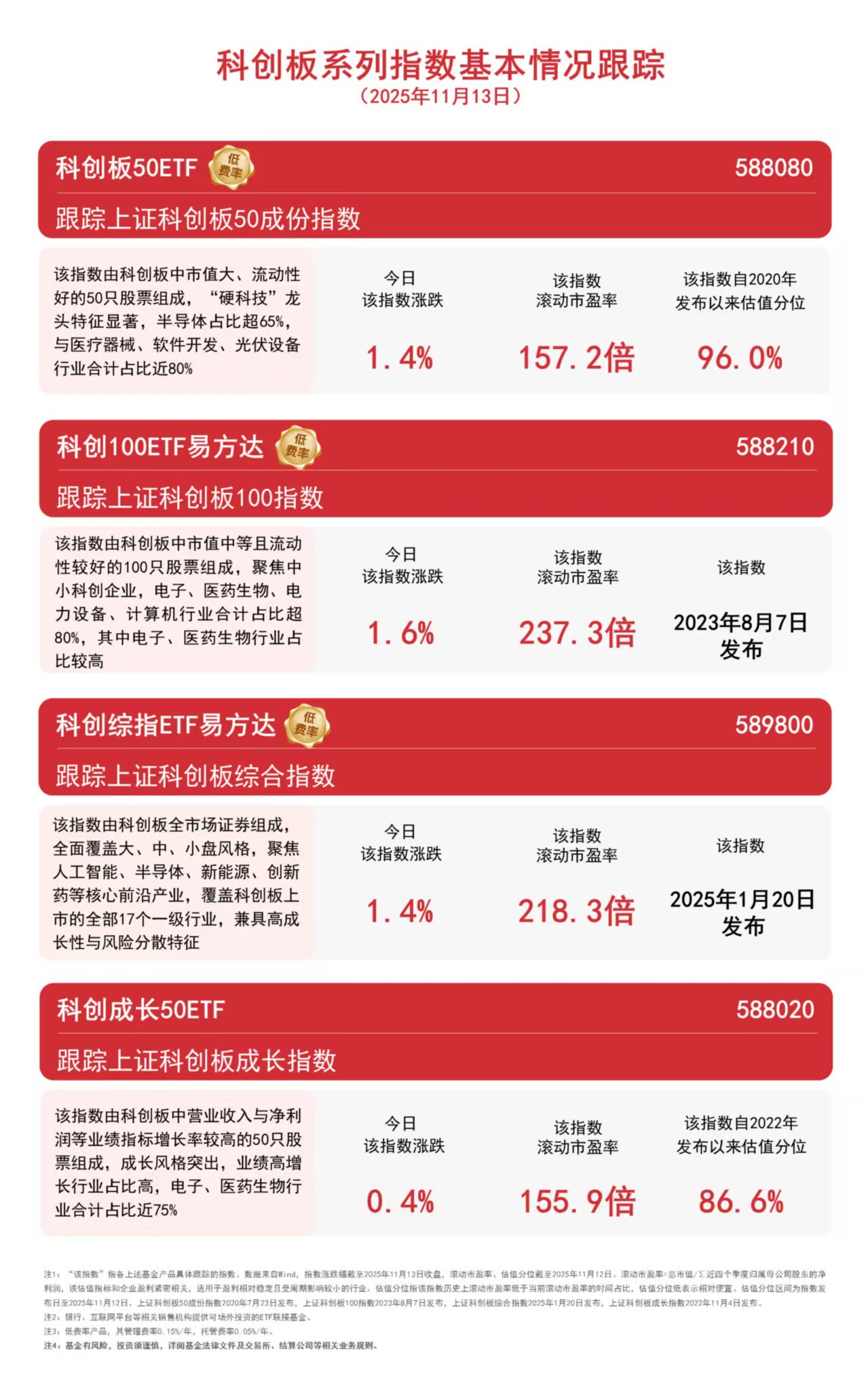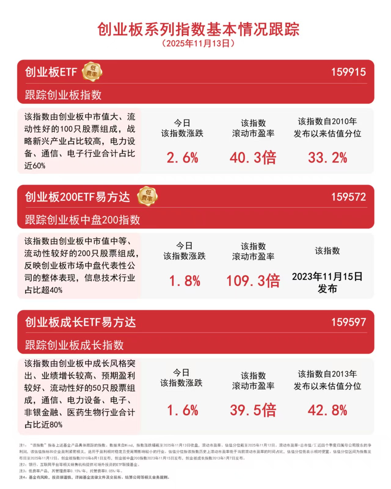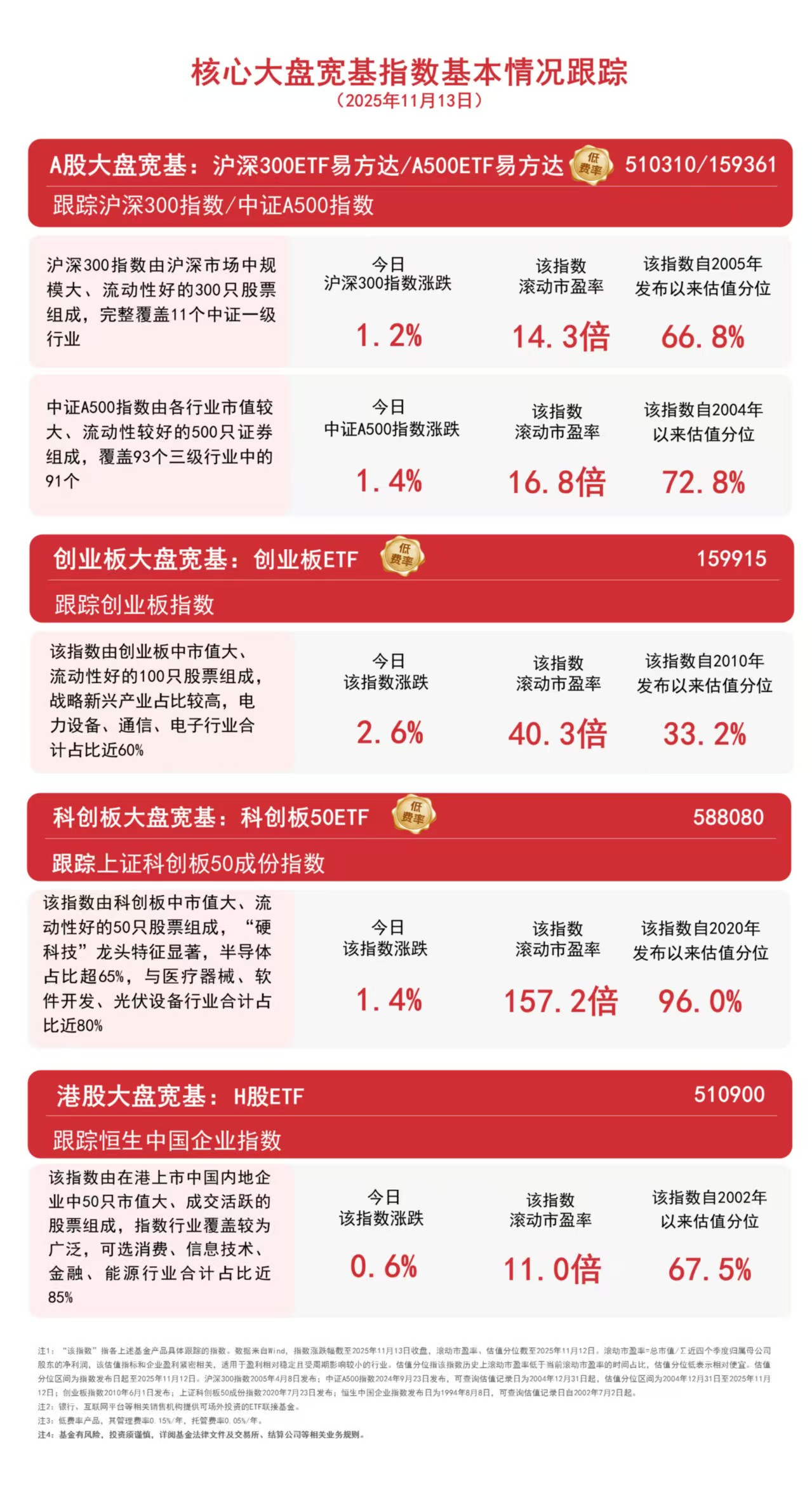A500ETF易方达(159361)、科创板50ETF(588080)、创业板ETF(159915)分别跟踪以上指数,且均实行ETF中最低一档0.15%/年的管理费率,为投资者构建攻守兼备的投资组合提供了多样化选择。