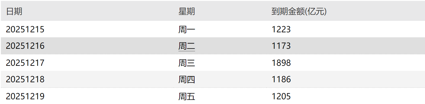 财联社12月12日电,Wind数据显示,本周央行公开市场开展了6685亿元逆回购操作,因本周有6638亿元逆回购到期,本周实现净投放47亿元。Wind数据显示,下周央行公开市场将有6685亿元逆回购到期,其中下周一至下周五分别到期1223亿元、1173亿元、1898亿元、1186亿元、1205亿元。此外,下周一将有4000亿元182天期买断式逆回购到期、800亿元国库现金定存到期。