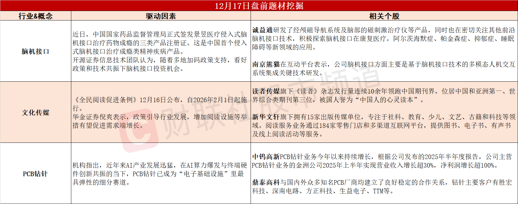 ①我国又一侵入式脑机接口产品获批,脑机接口迎来产业加速发展期。②《全民阅读促进条例》12月16日公布,政策有望引导阅读需求增长。③“电子基础设施”里最具弹性的细分赛道,PCB钻针市场需求旺盛。