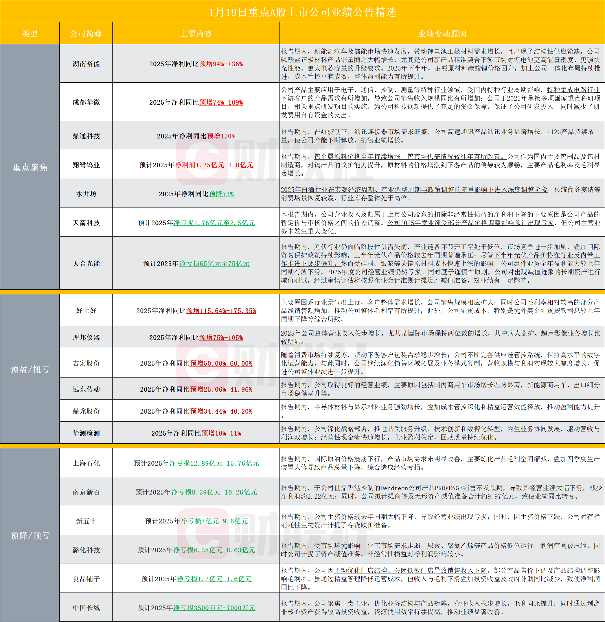 财联社1月19日电,据财联社不完全统计,截至发稿,盘后包括湖南裕能、成都华微、鼎通科技、翔鹭钨业、水井坊、天箭科技、天合光能、好上好、理邦仪器、吉宏股份、远东传动、鼎龙股份、华测检测、上海石化、南京新百、新五丰、潞化科技、良品铺子、中国长城等多家A股上市公司发布2025年业绩预告。其中,湖南裕能公告,2025年净利同比预增94%-136%,下半年碳酸锂价格回升带动整体盈利能力有所提升。天合光能公告,预计2025年净亏损65亿元到75亿元。