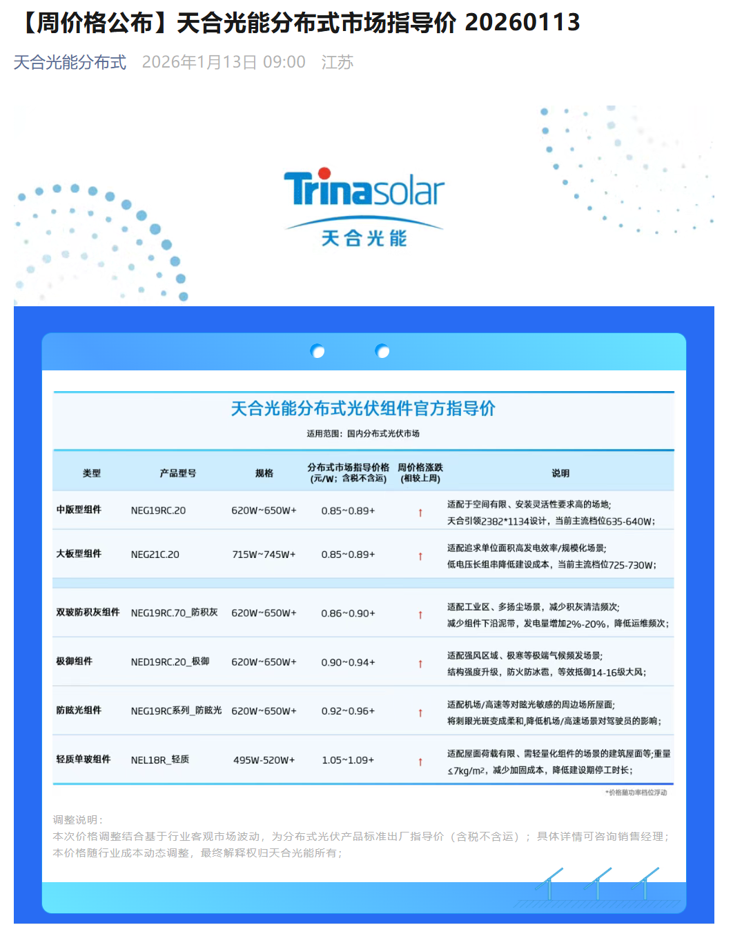 财联社1月13日电,据天合光能分布式微信公众号13日消息,天合光能分布式光伏组件官方指导价公布。据最新报价,组件报价最低价达0.85元/W,对比1月1日的报价,上涨了3分/瓦。