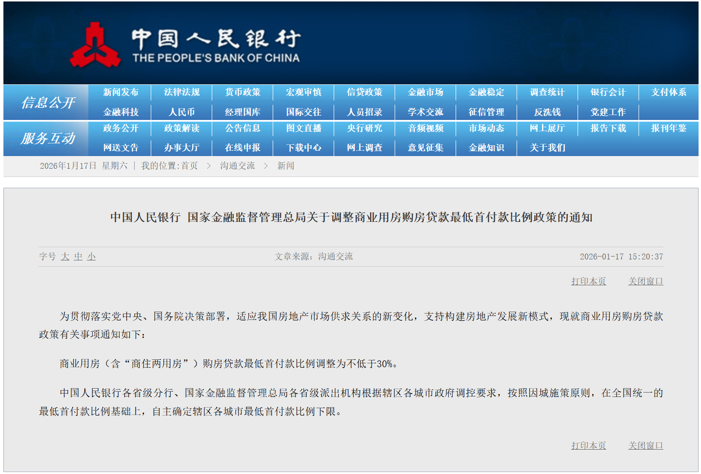 财联社1月17日电,中国人民银行、国家金融监督管理总局1月17日联合发布通知称,商业用房(含“商住两用房”)购房贷款最低首付款比例调整为不低于30%。中国人民银行各省级分行、国家金融监督管理总局各省级派出机构根据辖区各城市政府调控要求,按照因城施策原则,在全国统一的最低首付款比例基础上,自主确定辖区各城市最低首付款比例下限。
